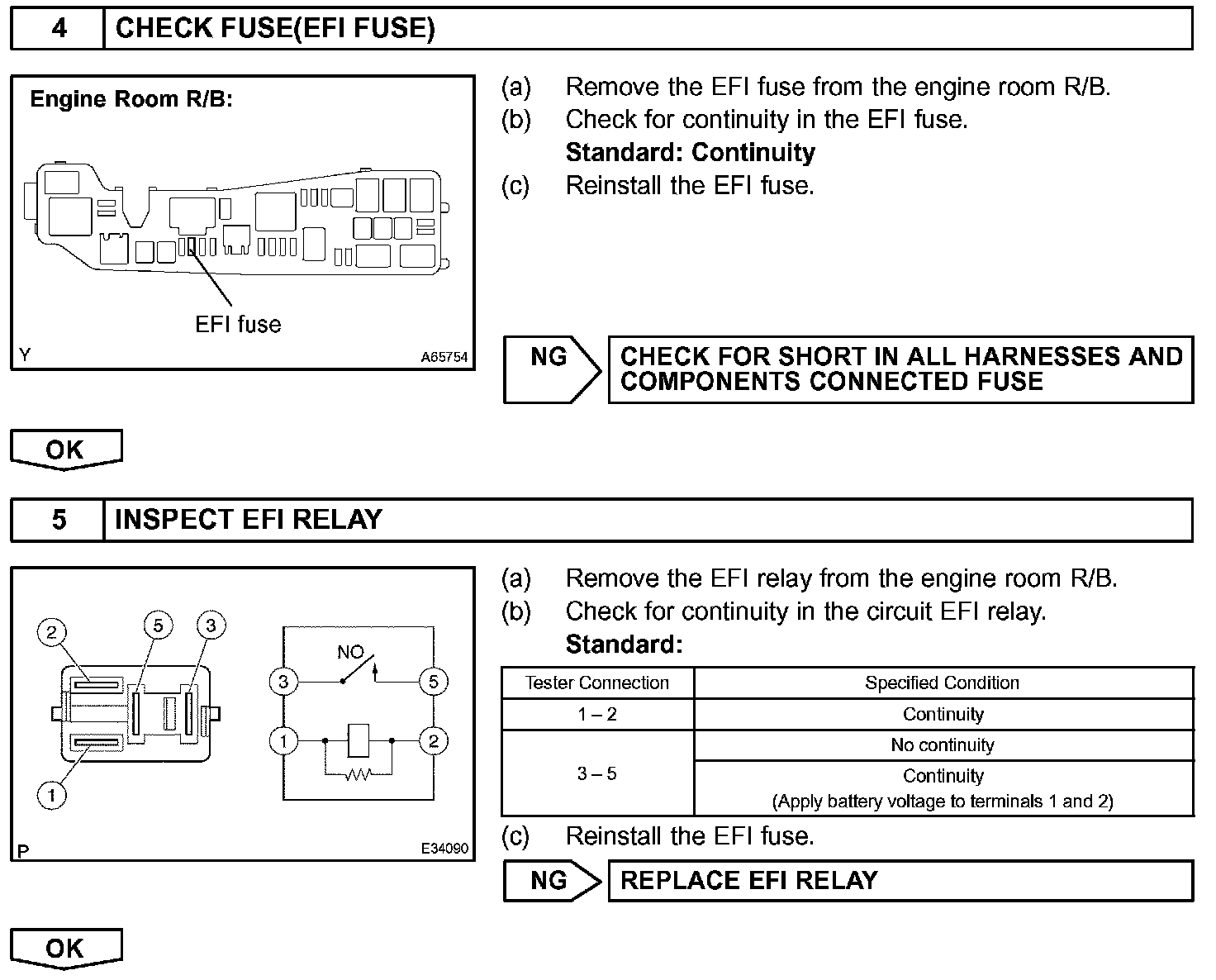 When the ignition switch is turned ON, battery positive voltage is applied to the coil which closes the contacts of the EFI main relay (Marked: EFI) and supplies power to terminal +B of the ECM.