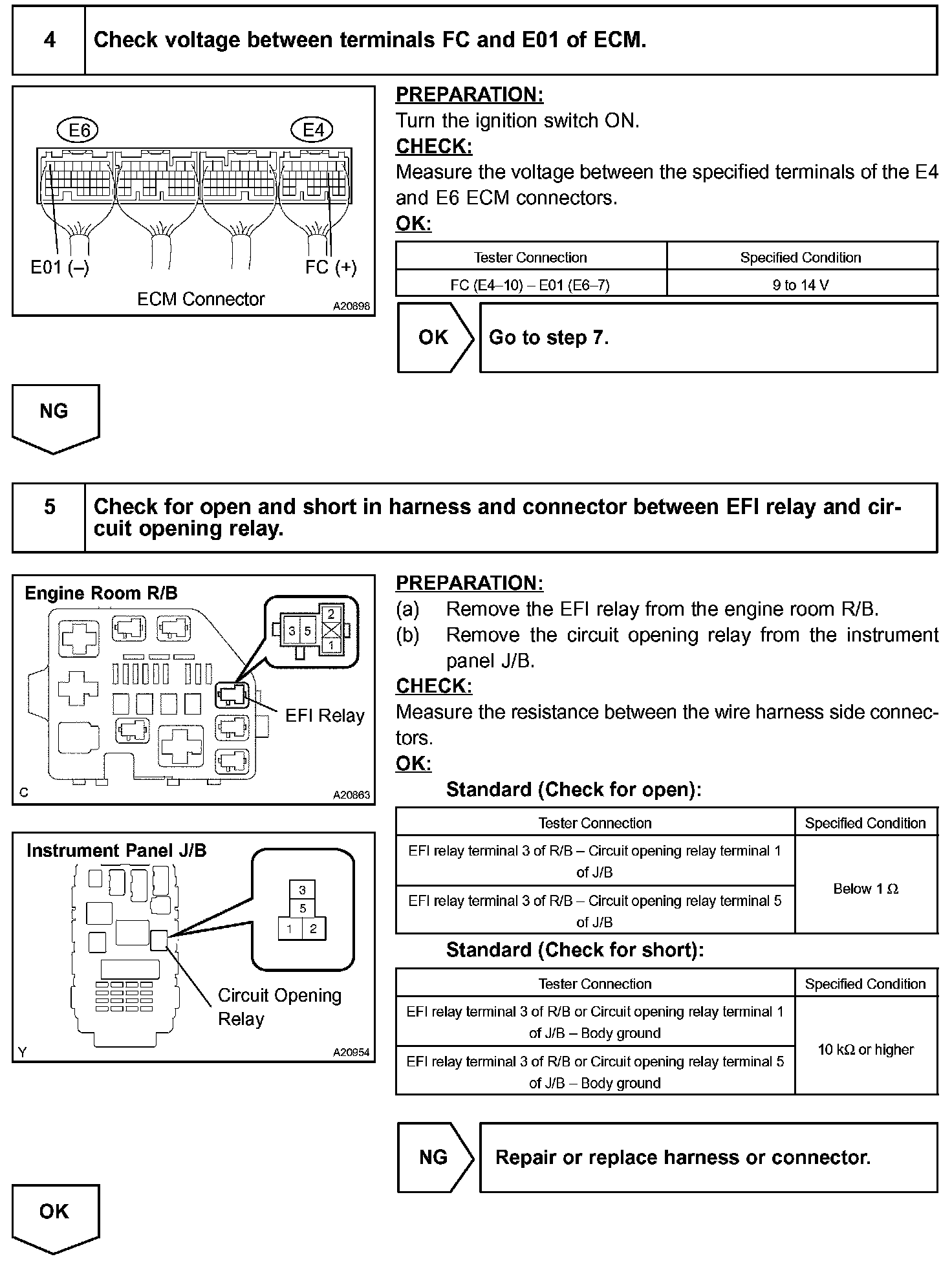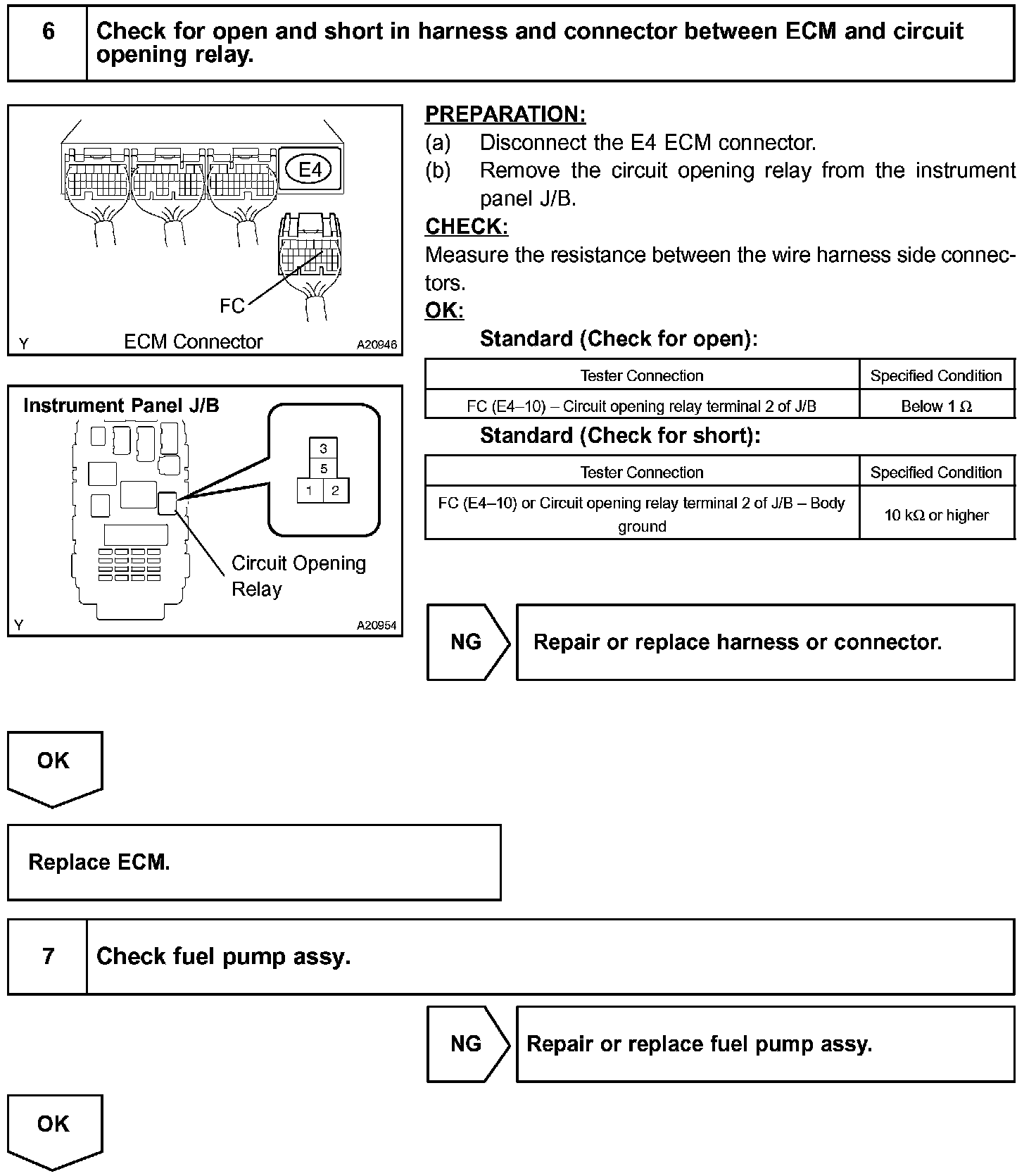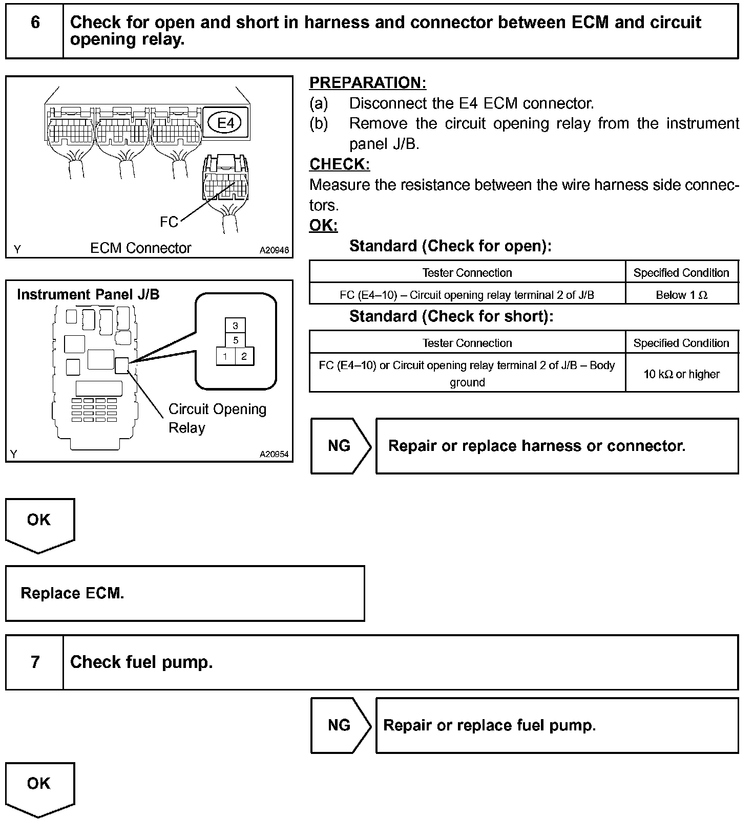 When the STA signal and NE signal are input to the ECM, Tr is turned ON, current flows to the coil of the circuit opening relay, the relay switches on, power is supplied to the fuel pump and the fuel pump operates. While the NE signal is generated (engine running), the ECM keeps Tr ON (circuit opening relay ON) and the fuel pump also keeps operating.