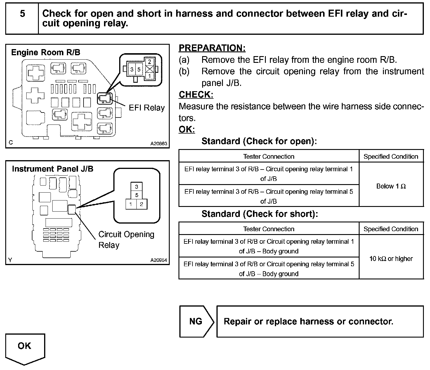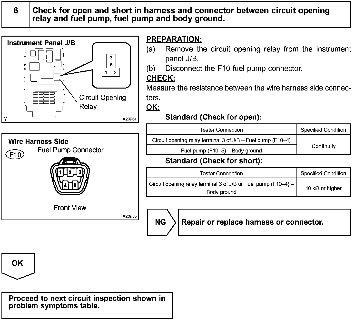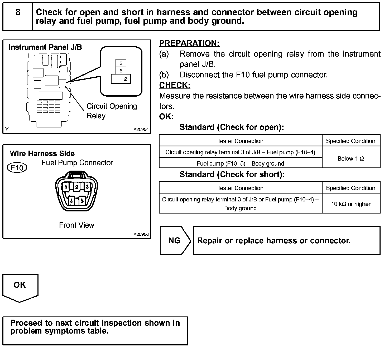 When the STA signal and NE signal are input to the ECM, Tr is turned ON, current flows to the coil of the circuit opening relay, the relay switches on, power is supplied to the fuel pump and the fuel pump operates. While the NE signal is generated (engine running), the ECM keeps Tr ON (circuit opening relay ON) and the fuel pump also keeps operating.