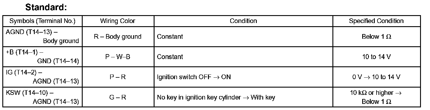 b. Reconnect the T14 ECU connector, and measure the voltage between each terminal of the connector.