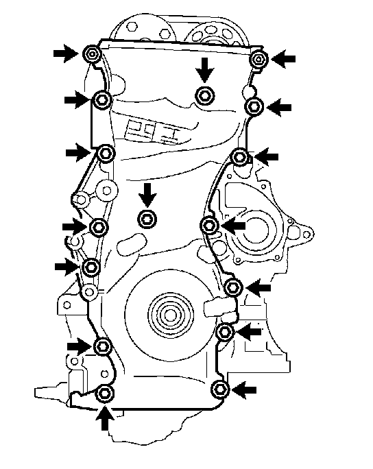 d. Install the timing chain cover with the 14 bolts and 2 nuts.