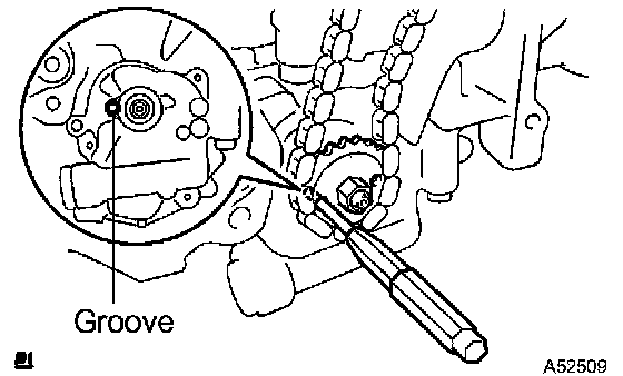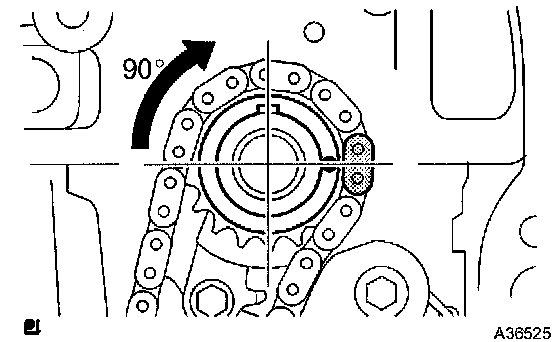 a. Turn the crankshaft counterclockwise 90°, and align an adjusting hole of the oil pump driven sprocket with the groove of the oil pump.