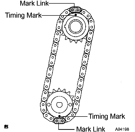 c. Align the mark links (yellow colored links) with the timing marks of the sprocket as shown in the illustration.