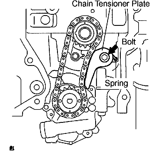 c. Remove the bolt, chain tensioner plate and spring.