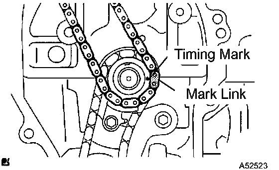 b. Align the mark link (gold or orange colored link) with the timing mark of the crankshaft timing sprocket.