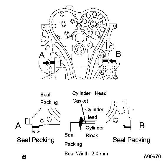 b. Apply seal packing in a continuous bead (seal width: 2.0 mm (0.079 inch) as shown in the illustration.
