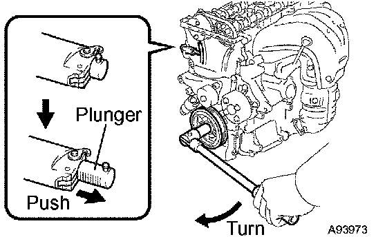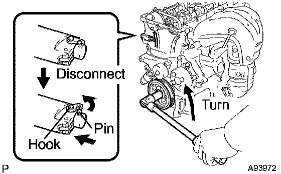 c. Turn the crankshaft counterclockwise and check that the plunger knock pin is disconnected from the hook.