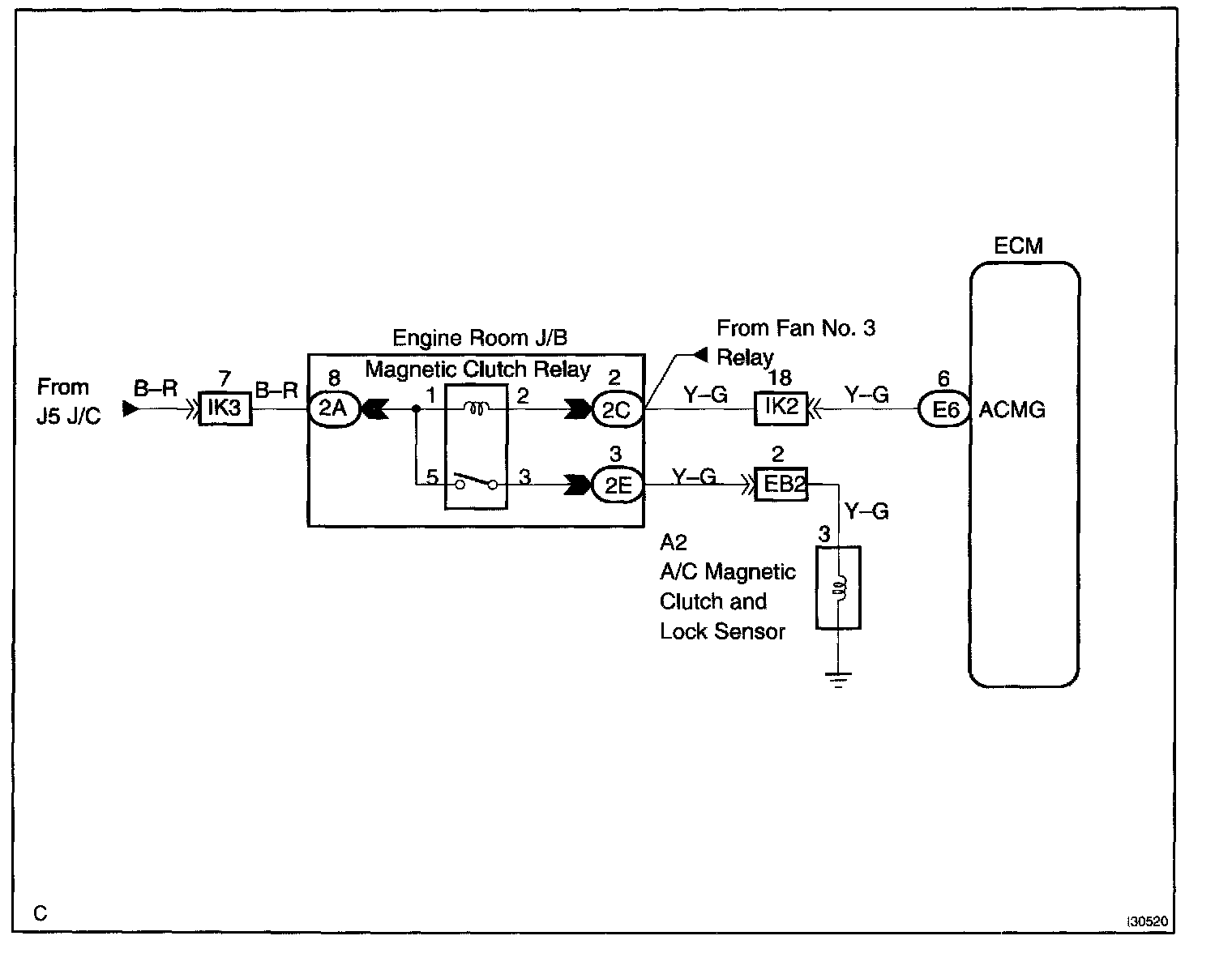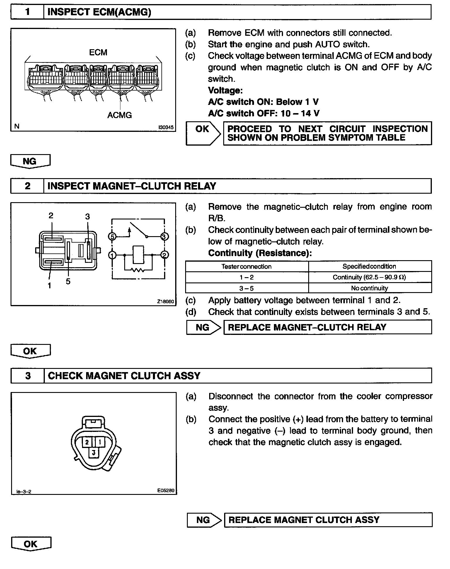 CIRCUIT DESCRIPTIONThe A/C amplifier assy outputs the magnetic clutch ON signal from terminal MPX to the ECM receives this signal, it sends a signal from terminal ACMG and switches the magnetic clutch relay ON, thus turning on the magnetic clutch.