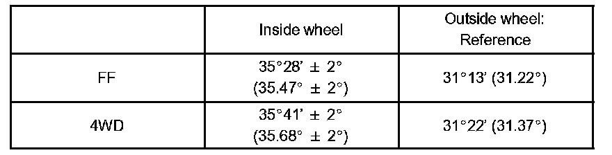 If the right and left inside wheel angles differ from the specified value, check and adjust the right and left rack end lengths.