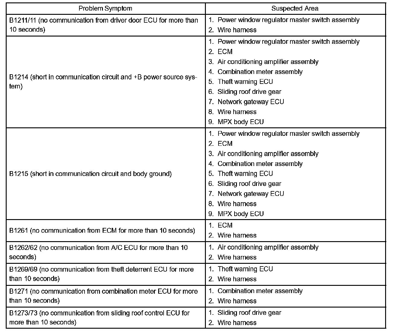 PROBLEM SYMPTOMS TABLE