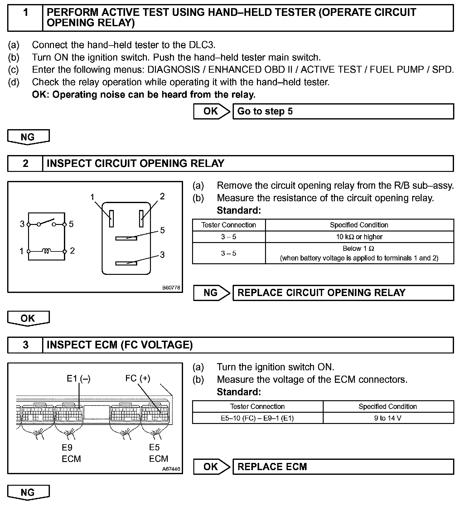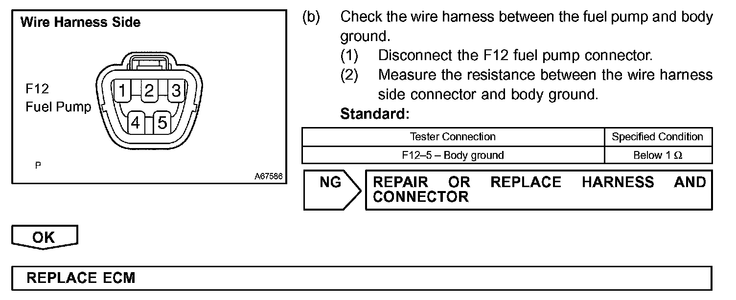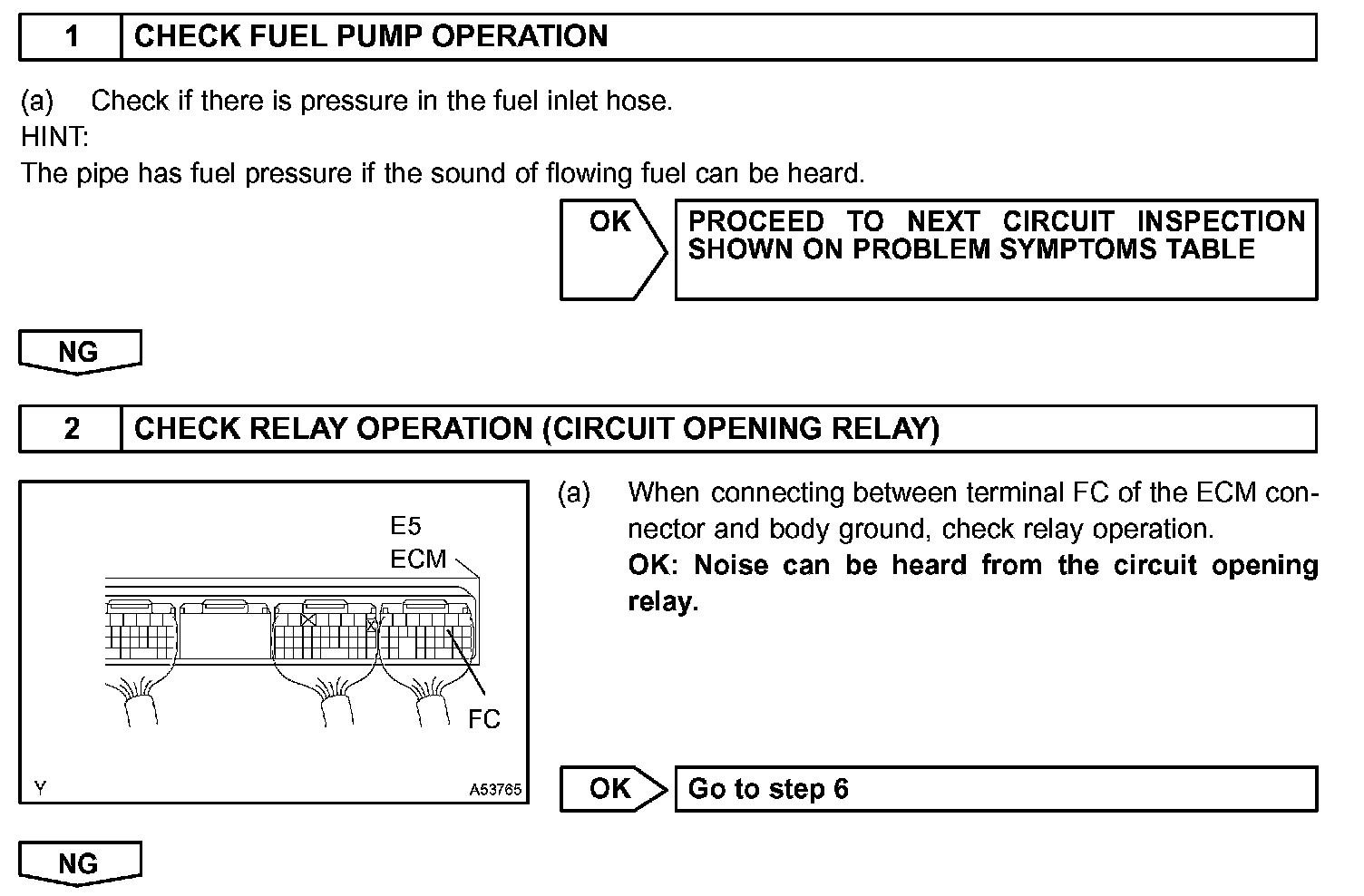 While the NE signal is generated and the engine is running, the ECM keeps Tr ON (Circuit Opening relay ON) and the fuel pump also keeps operating.