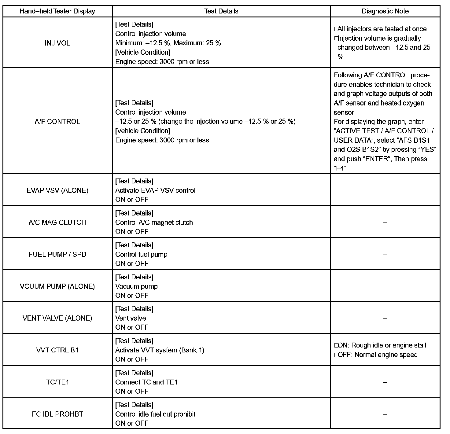 ACTIVE TESTHINT: Performing the hand-held tester ACTIVE TEST allows relay, VSV, actuator and other items to be operated without removing any parts. Performing the ACTIVE TEST early in troubleshooting is one way to shorten labor time. The DATA LIST can be displayed during the ACTIVE TEST