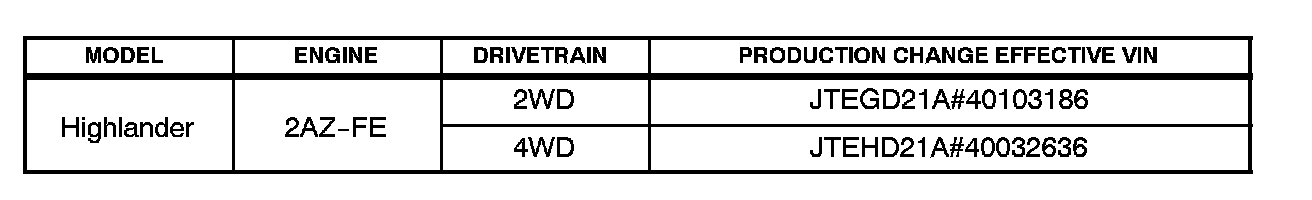 ^ 2004 model year Highlander vehicles equipped with 2AZ-FE engines produced BEFORE the Production Change Effective VINs shown below.