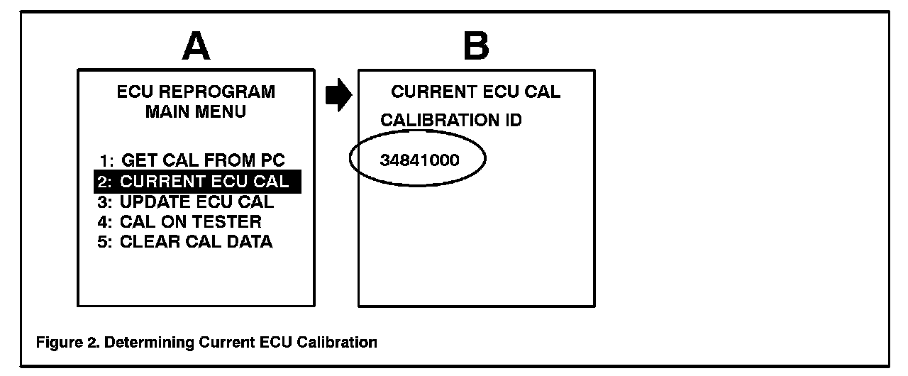 2. Connect the Diagnostic Tester to the vehicle's DLC3 connector and select CURRENT ECU CAL from the ECU REPROGRAM MAIN MENU. Determine the vehicle's current ECU calibration (see Figure 2).