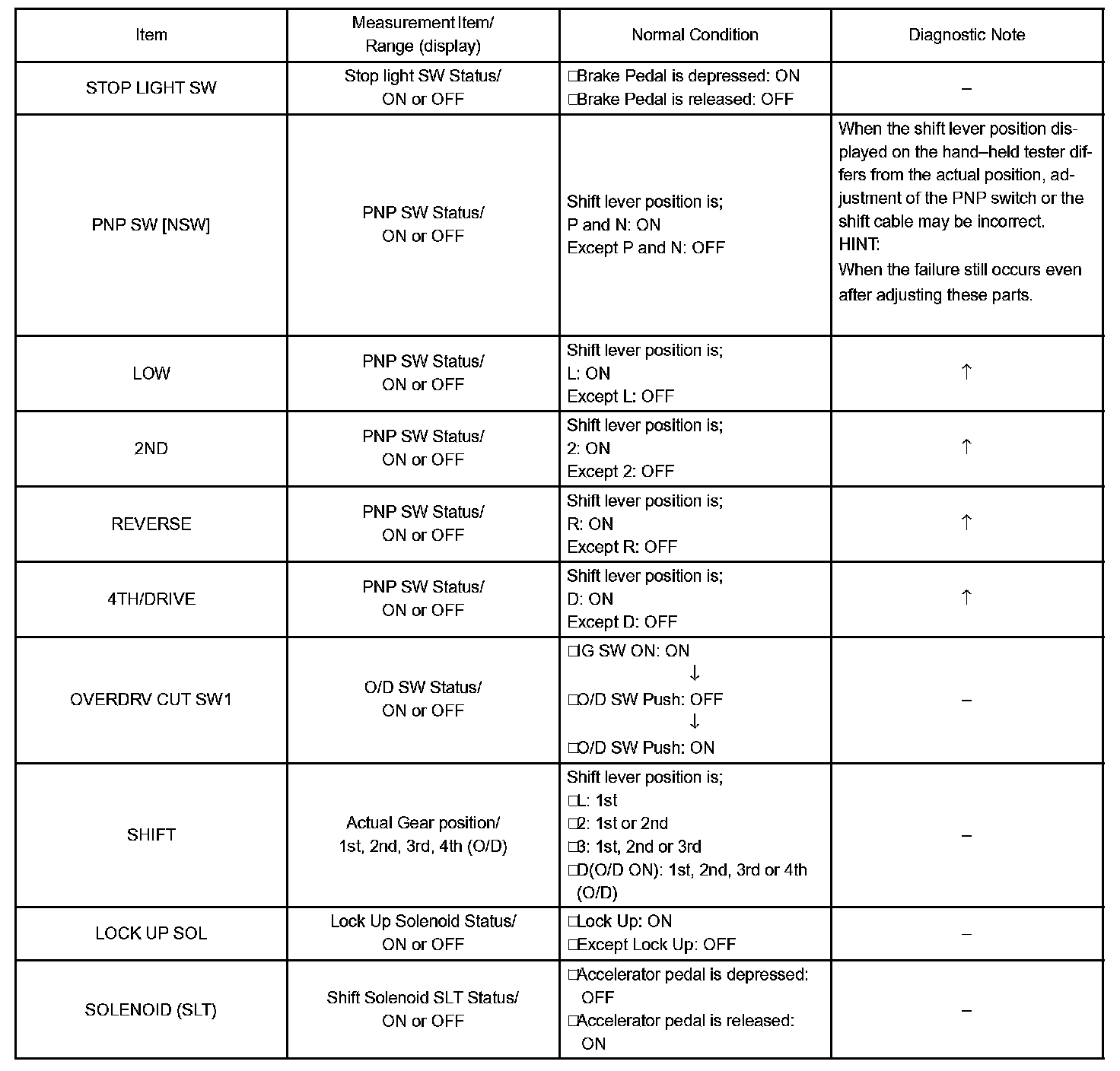 DATA LISTHINT: According to the DATA LIST displayed by the OBD II scan tool or hand-held tester, you can read the value of the switch, sensor, actuator and so on without parts removal. Reading the DATA LIST as the first step of troubleshooting is one method to shorten labor time.