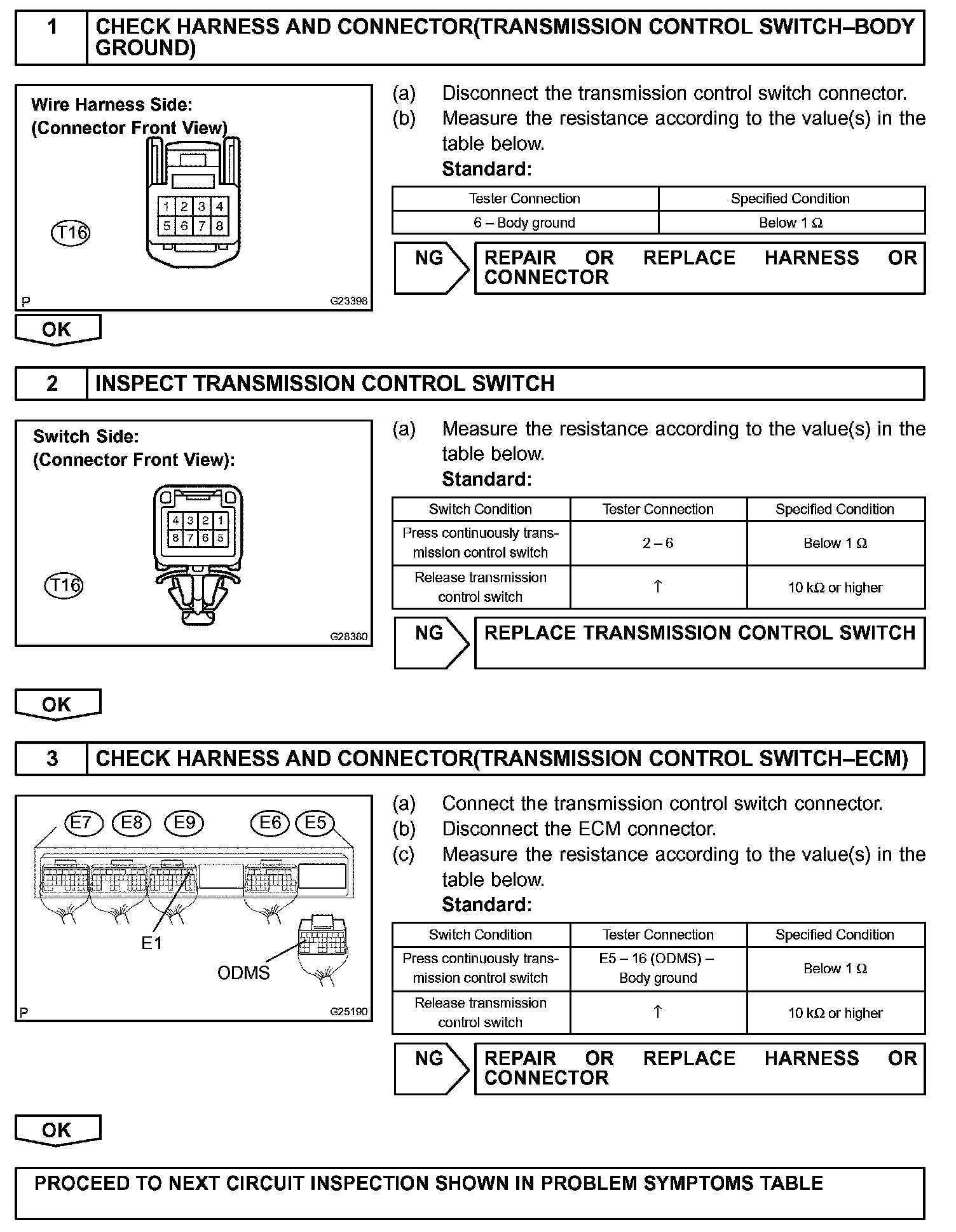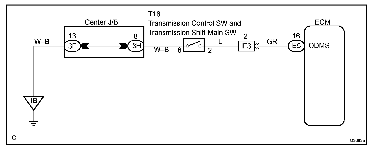 The O/D main switch (transmission control switch) is a momentary type switch. When pressing the O/D main switch, the O/D OFF indicator light lights up and the ECM prohibits shifting into O/D, and when pressing it once again, the O/D OFF indicator light goes off and the ECM allows shifting into O/D. Turning the IG switch OFF will reset the O/D OFF indicator light.