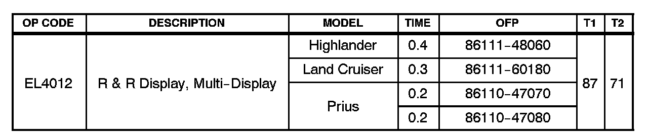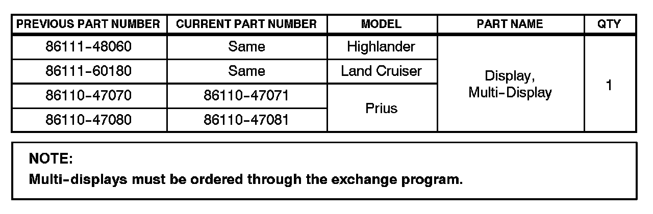 ^ For Highlander multi-display Removal and Replacement, refer to the Technical Information System (TIS), 2004 model year Highlander Repair Manual: Audio & Visual System: Multi-display (CRT display): Replacement.