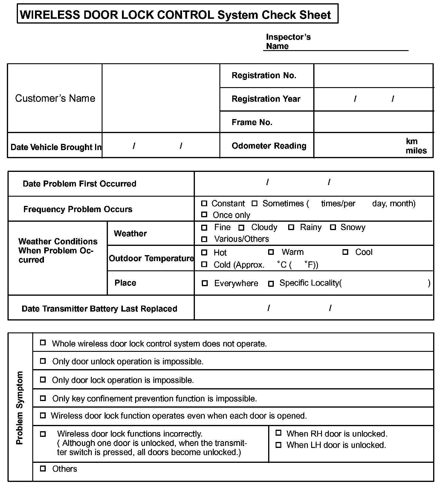 Wireless Door Lock Control System Check Sheet: