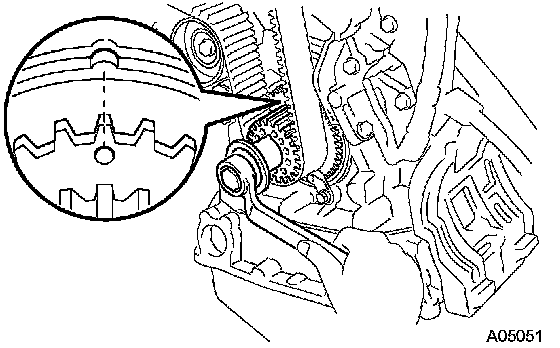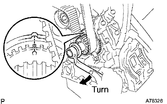 2. Turn the crankshaft clockwise, and align the timing marks of the crankshaft timing pulley and oil pump body.