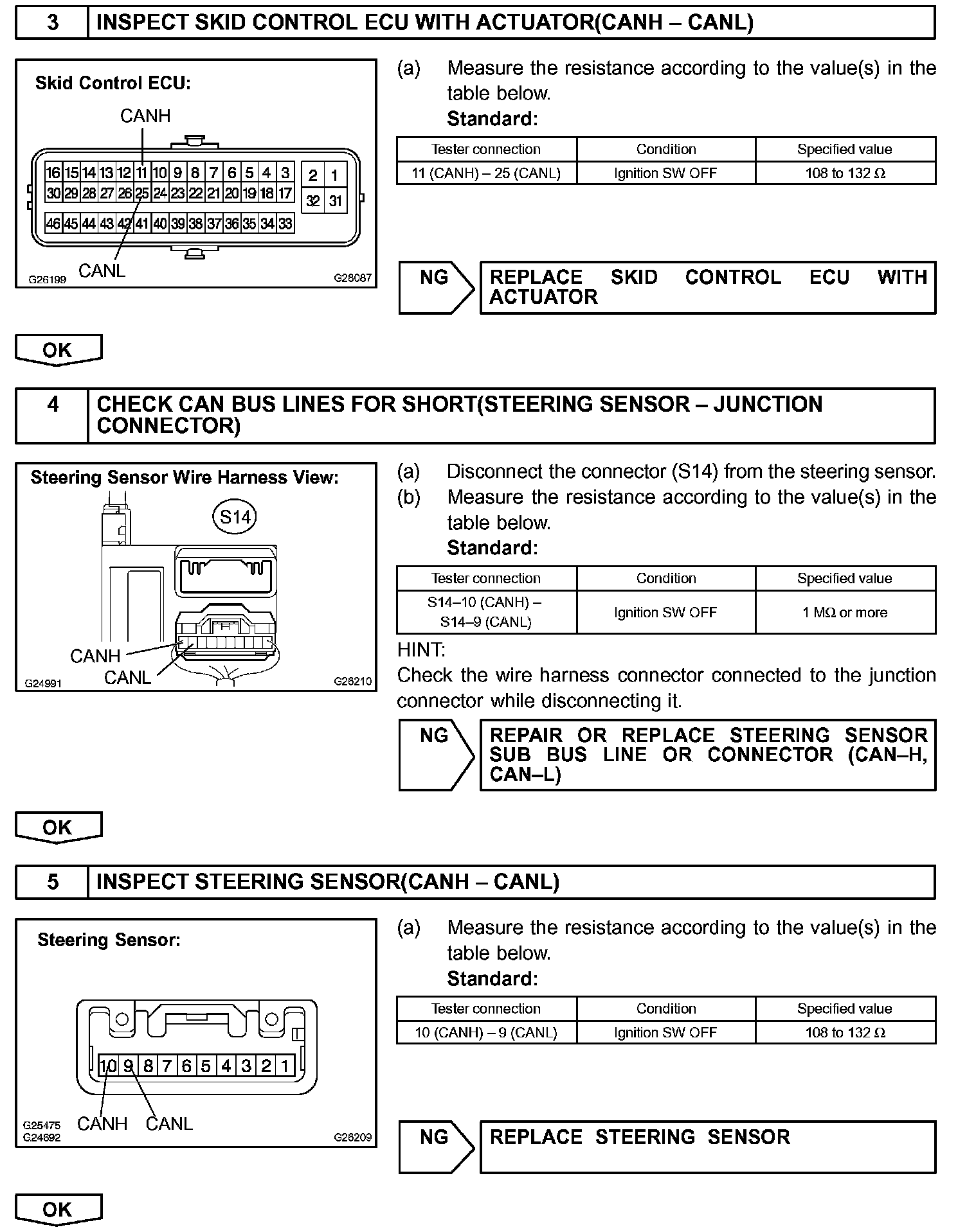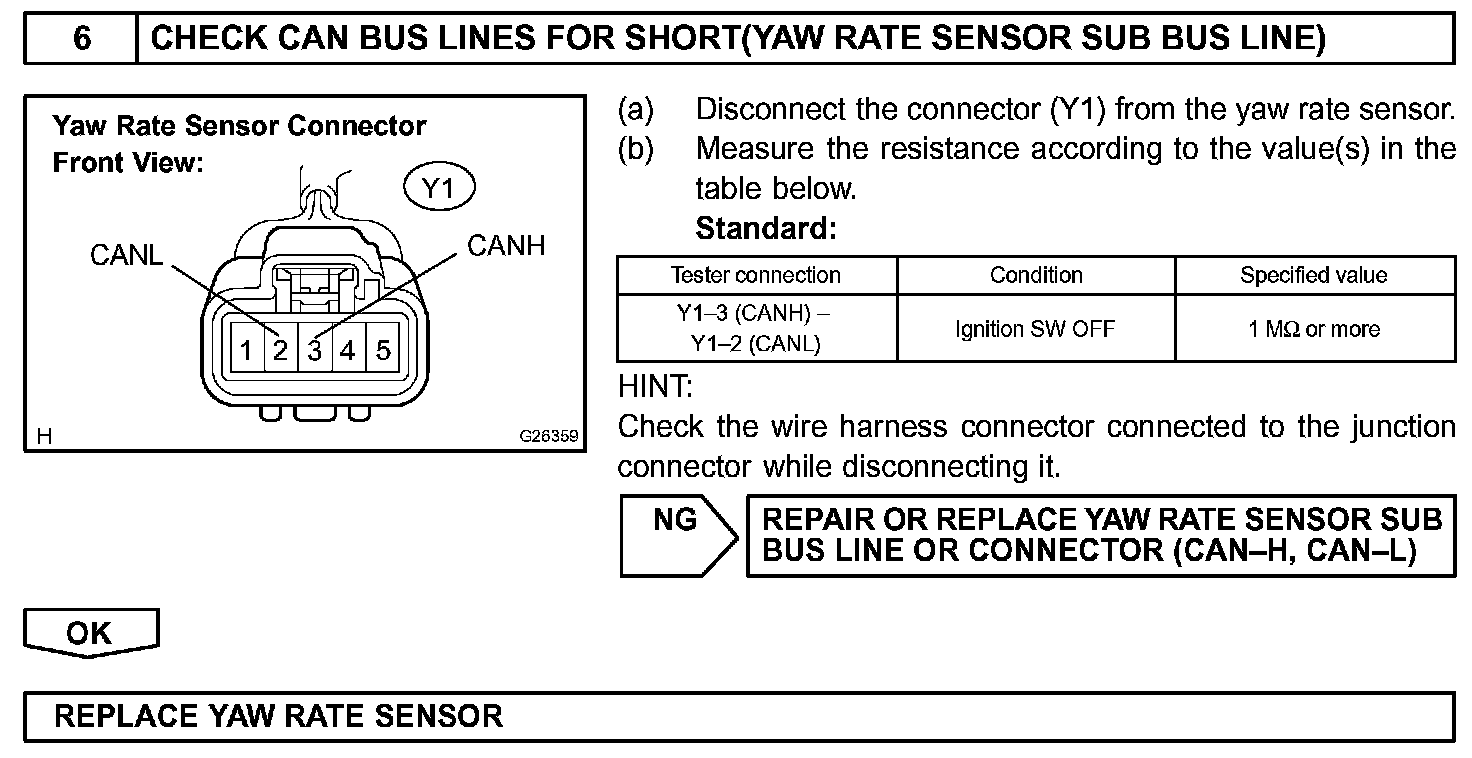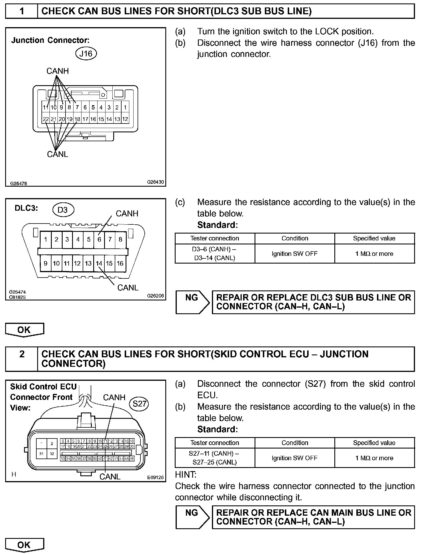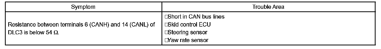 The CAN bus lines are considered to be shorted when the resistance between terminals 6 (CANH) and 14 (CANL) of the DLC3 is below 54 ohm.