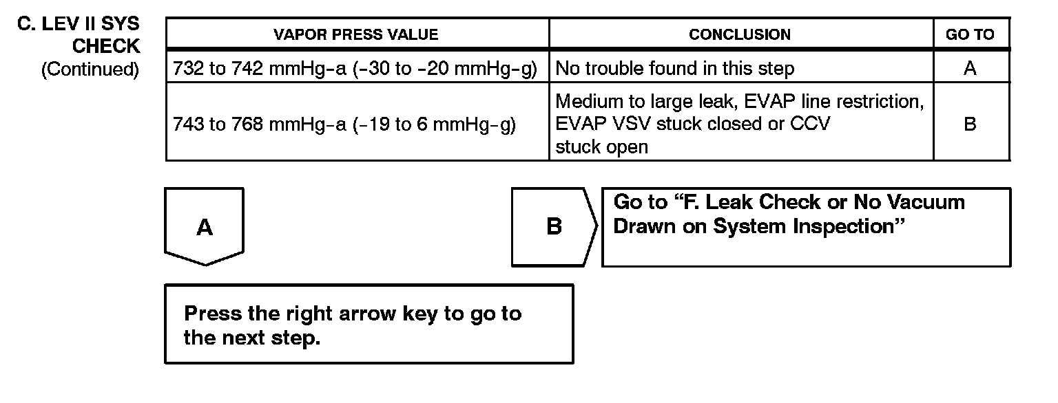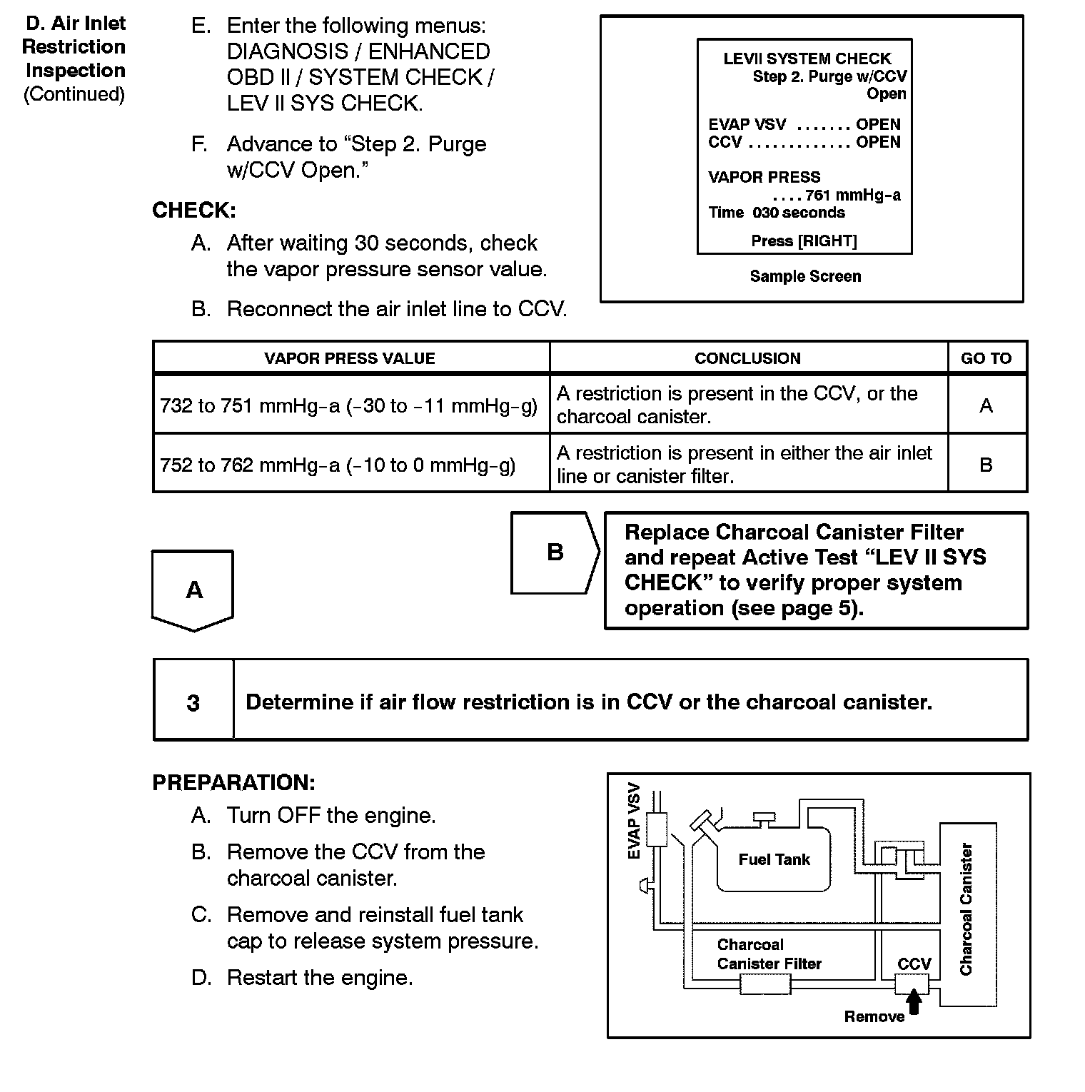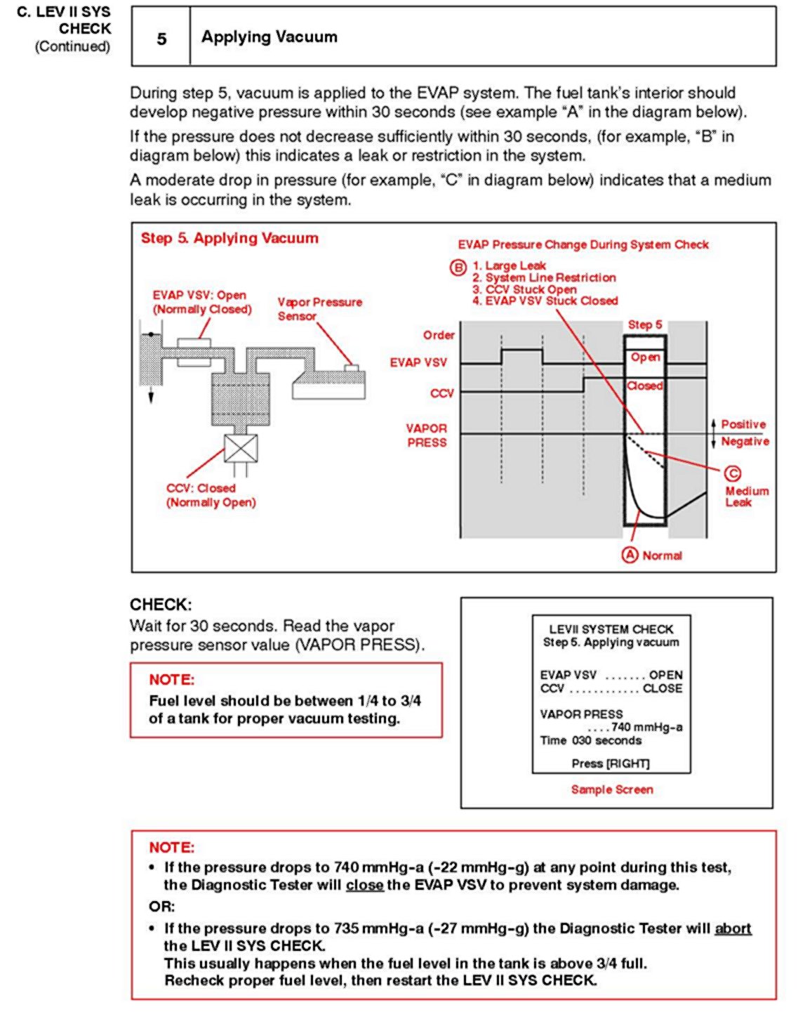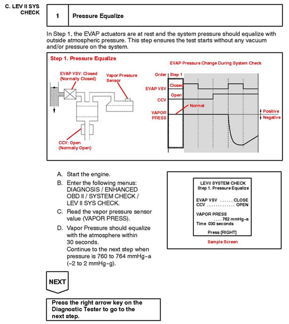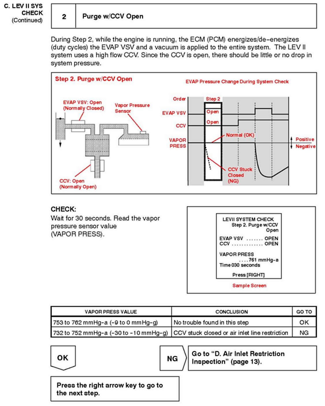 The LEV II System Check allows the Diagnostic Tester to display the fuel tank vapor pressure as the EVAP VSV and the CCV are operated in a specific six-step pattern. Problems with the EVAP system are quickly isolated by observing the change in vapor pressure during each step.