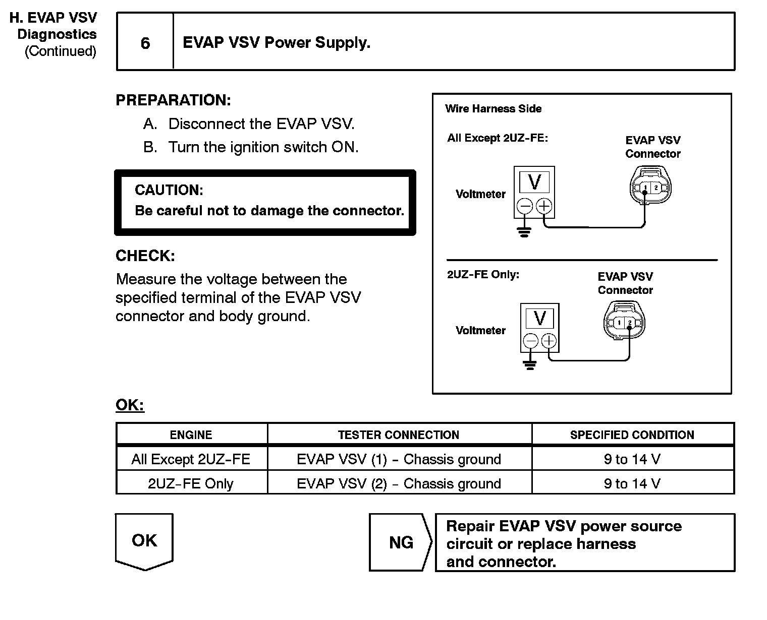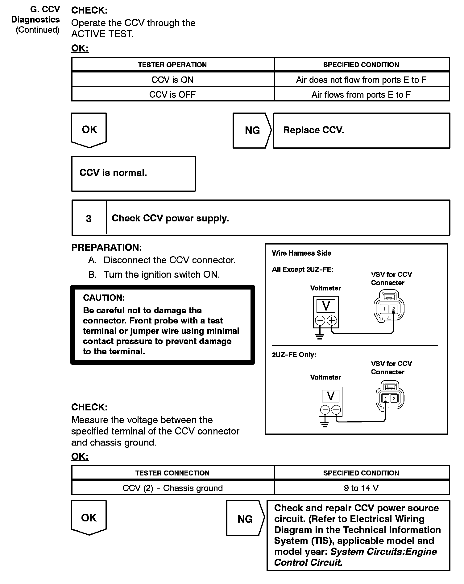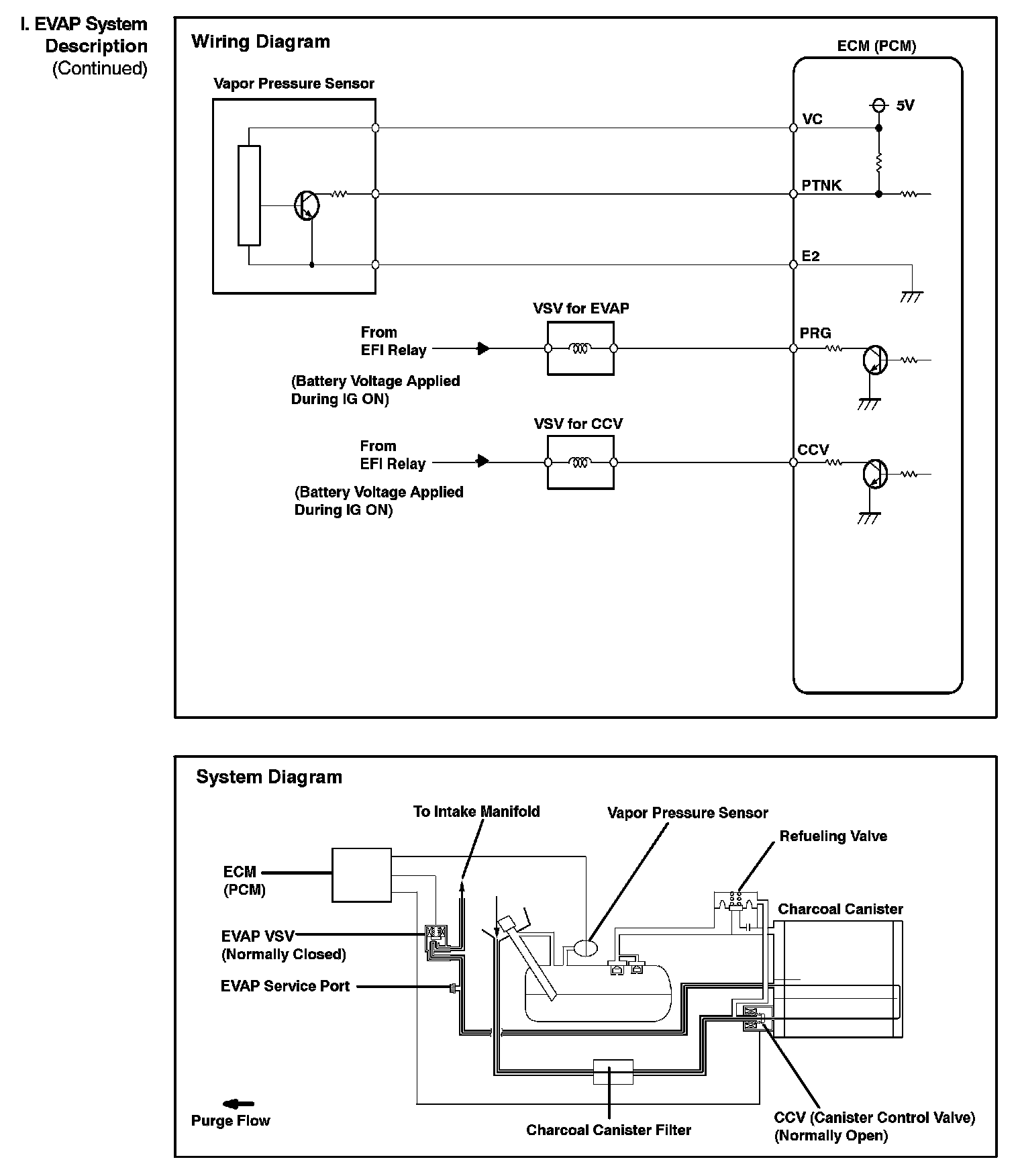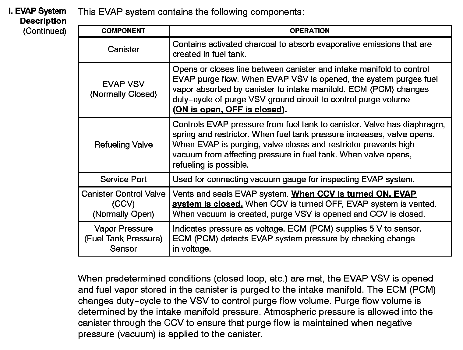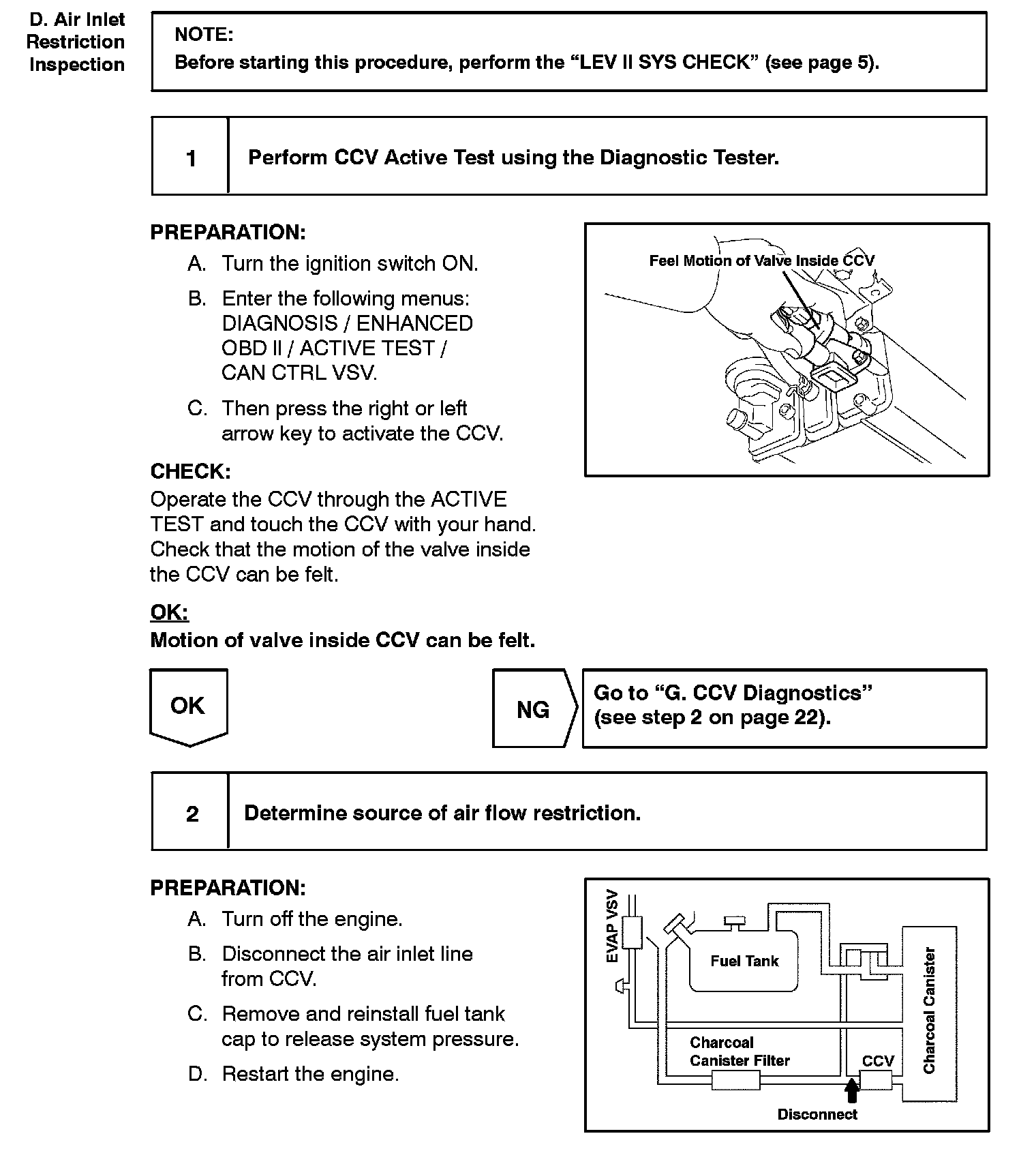 The LEV II System Check allows the Diagnostic Tester to display the fuel tank vapor pressure as the EVAP VSV and the CCV are operated in a specific six-step pattern. Problems with the EVAP system are quickly isolated by observing the change in vapor pressure during each step.