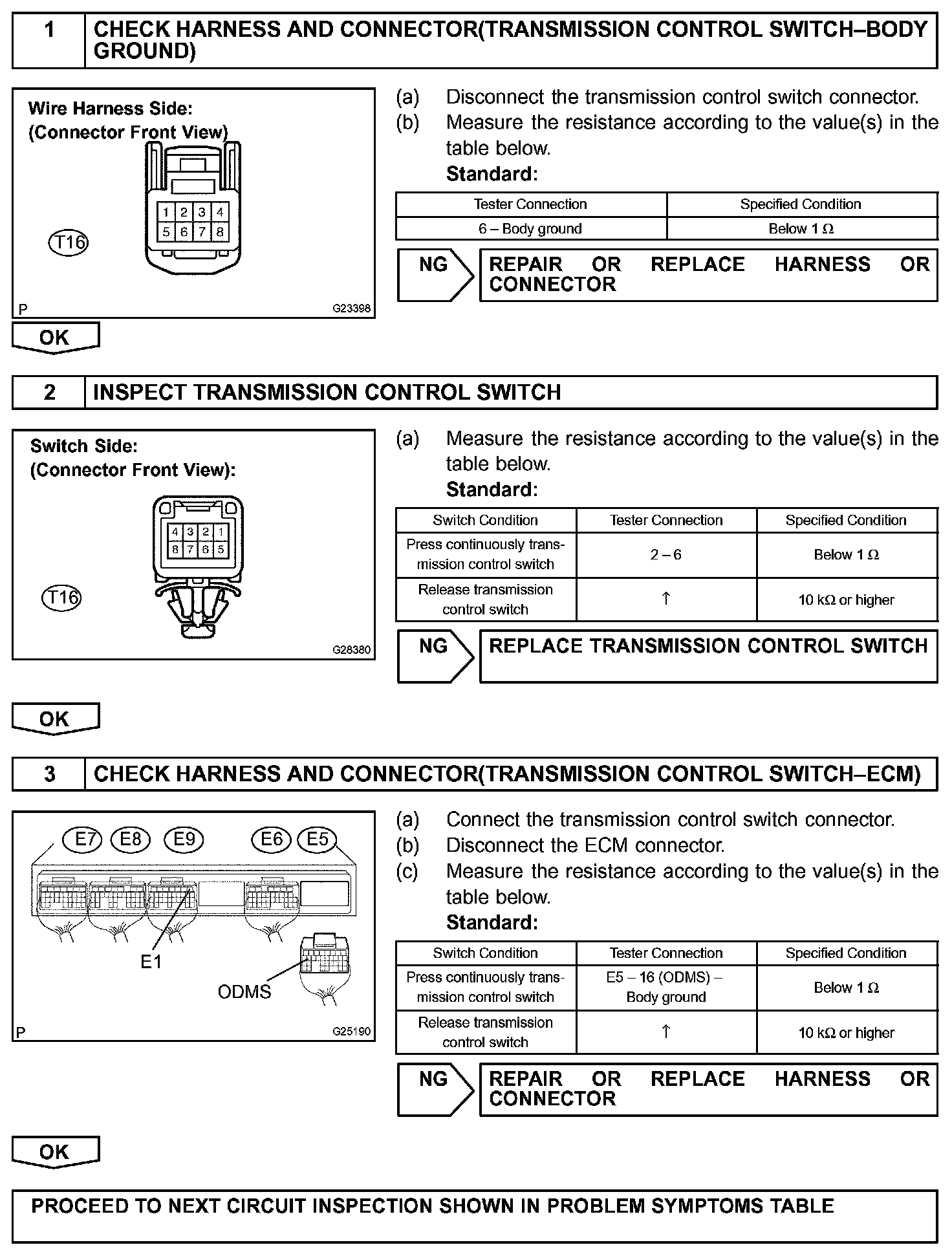 The O/D main switch (transmission control switch) is a momentary type switch. When pressing the O/D main switch, the O/D OFF indicator light lights up and the ECM prohibits shifting into O/D, and when pressing it once again, the O/D OFF indicator light goes off and the ECM allows shifting into O/D. Turning the IG switch OFF will reset the O/D OFF indicator light.