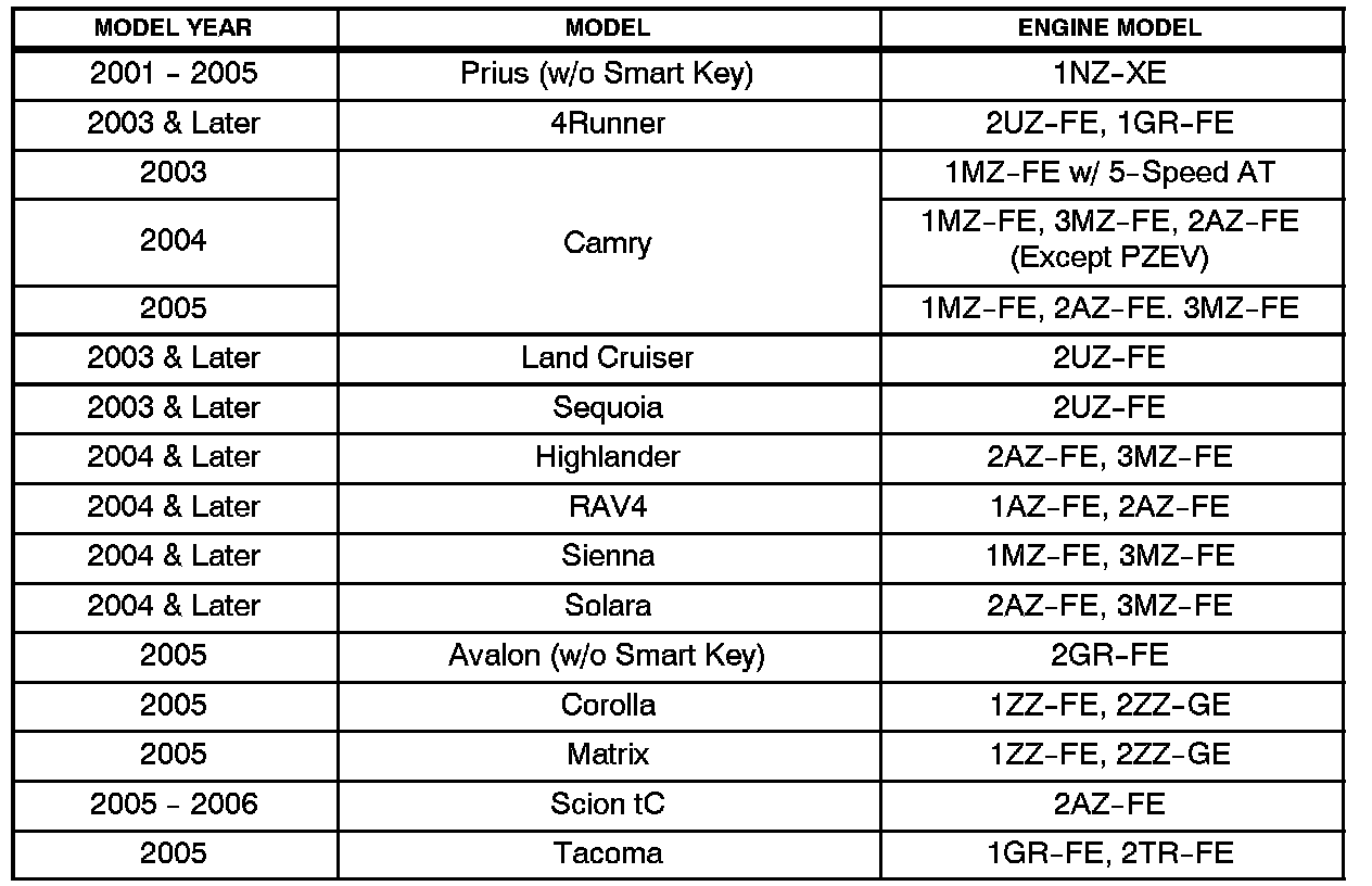 ^ August 26, 2005: The model years for each model have been specifically defined in the "Applicable Vehicles" section. The following vehicles have been added to the "Applicable Vehicles" section: Avalon, Corolla, Highlander, Matrix, Prius, RAV4, Scion tC, Sequoia, Solara, & Tacoma. The "Required SSTs" section has been updated.