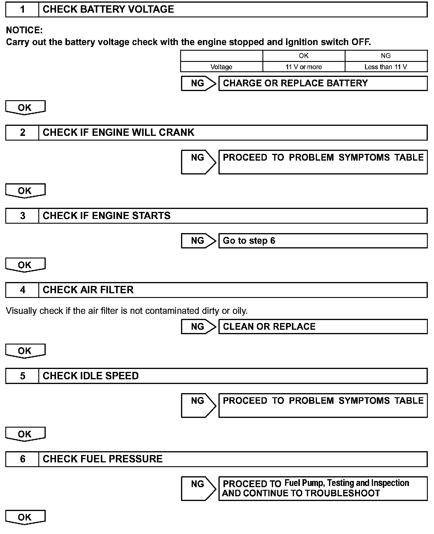 When the malfunction is not confirmed in the DTC check, troubleshooting should be carried out in all the possible circuits considered as possible causes of the problem. In many cases, by carrying out the basic engine check shown in the following flowchart, the problem can be found quickly and efficiently. Therefore, using this check is essential in the engine troubleshooting.