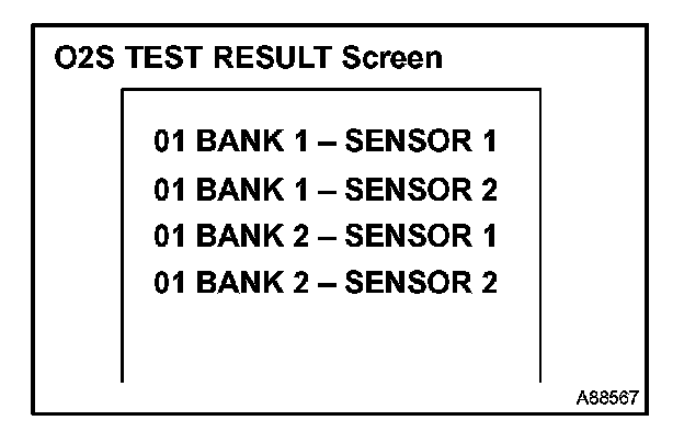 b. On the tester screen, select the following menus: DIAGNOSIS/ CARB OBDII/O2S TEST RESULT. A list of the O2S equipped on the vehicle will be displayed.