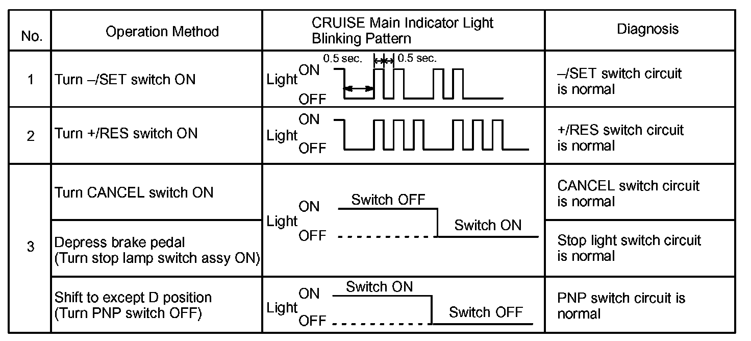 3. Check that the CRUISE main indicator light blinks twice or 3 times repeatedly after 3 seconds.