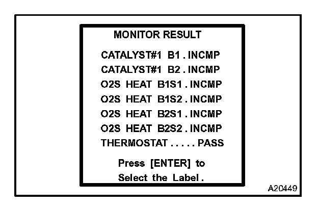 "MONITOR RESULT" from "DIAGNOSIS / ENHANCED OBD II / MONITOR INFO / MONITOR RESULT" the Test ID will appear at the beginning of each line, following by INCMP, PASS or FAIL.