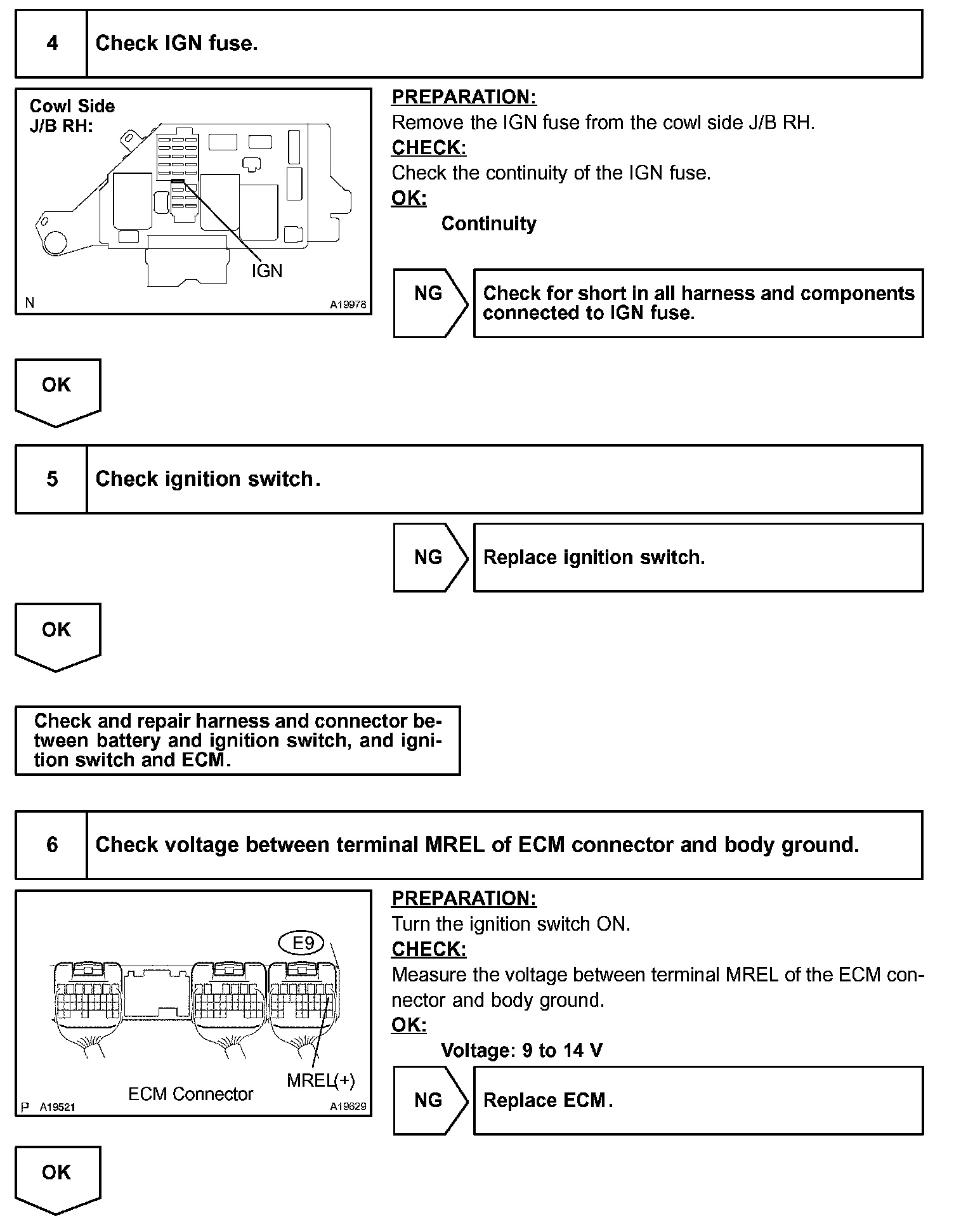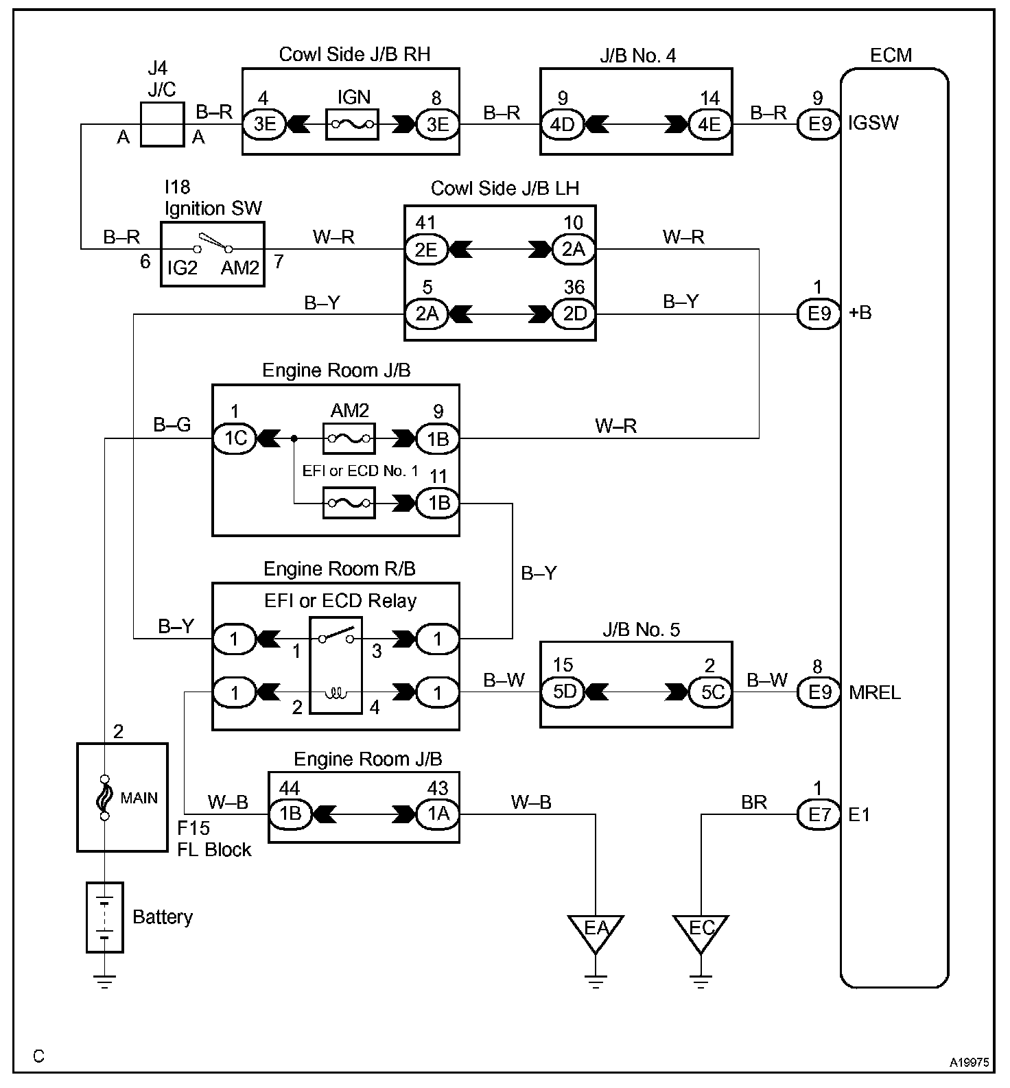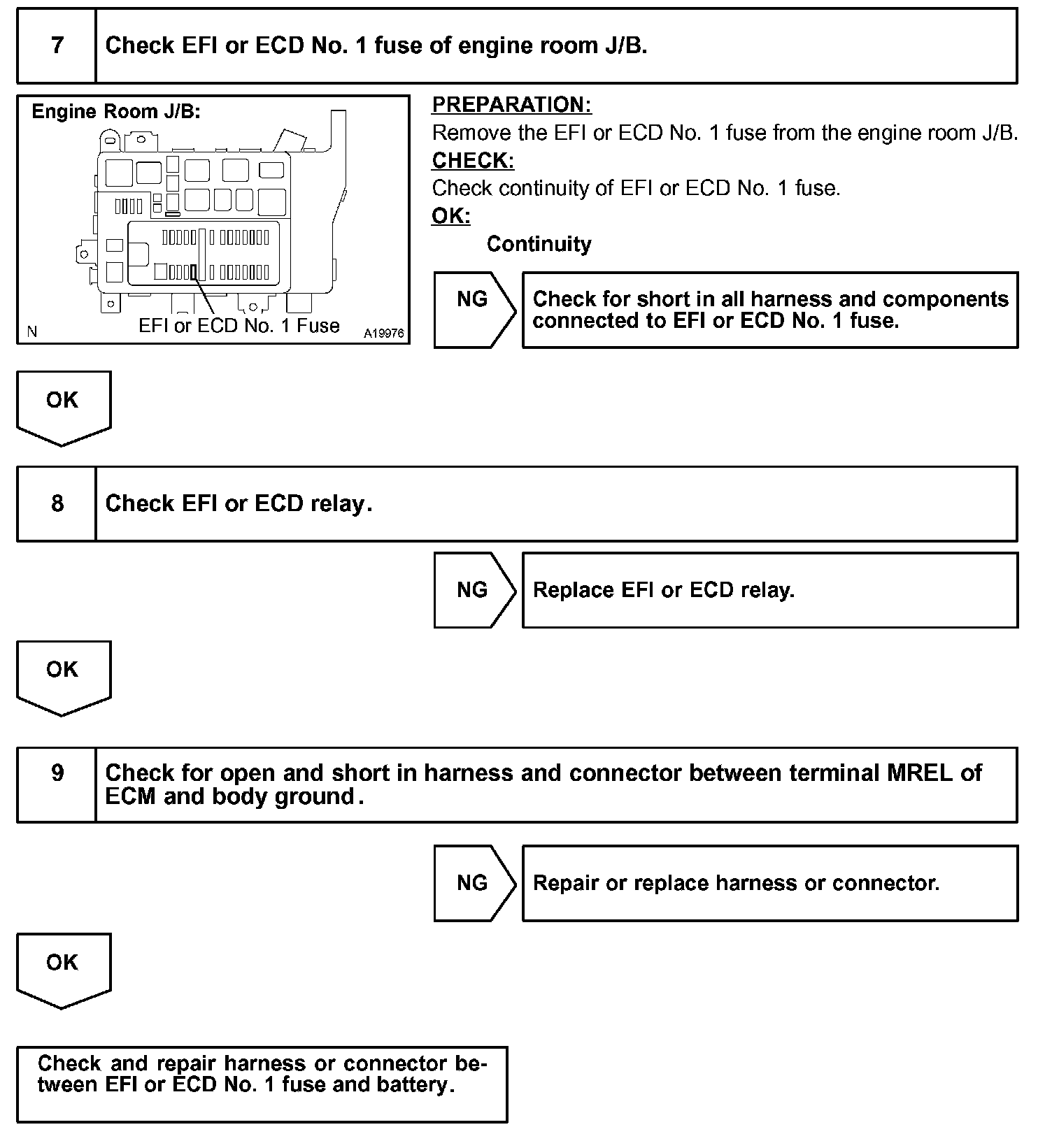 This signal causes current to flow to the coil, closing the contacts of the EFI or ECD relay and supplying power to terminal +B of the ECM.
