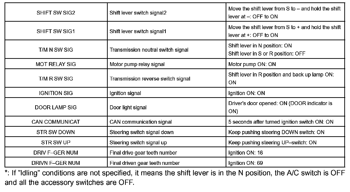 SEQUENTIAL MANUAL TRANSMISSION OPERATING CONDITIONNOTE: The values given for "Normal Condition" are reference values only. A vehicle may still be normal even if its value differs from those listed. Do not depend solely on the "Normal Condition" column when deciding whether a part is faulty or not.