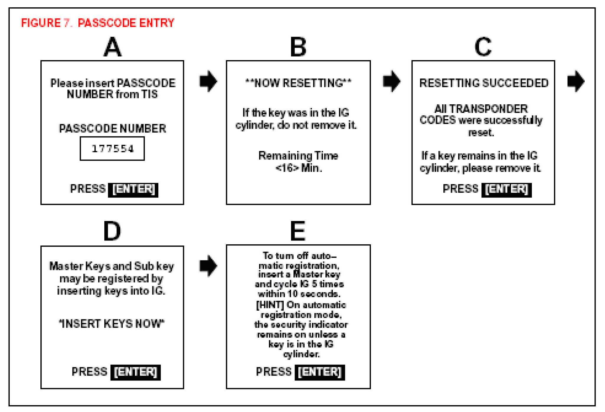 - If less than 4 keys are registered at this time, auto registration mode must be closed manually by cycling the ignition ON/OFF more than 5 times in 10 seconds. (See Figure 7, screen E.)