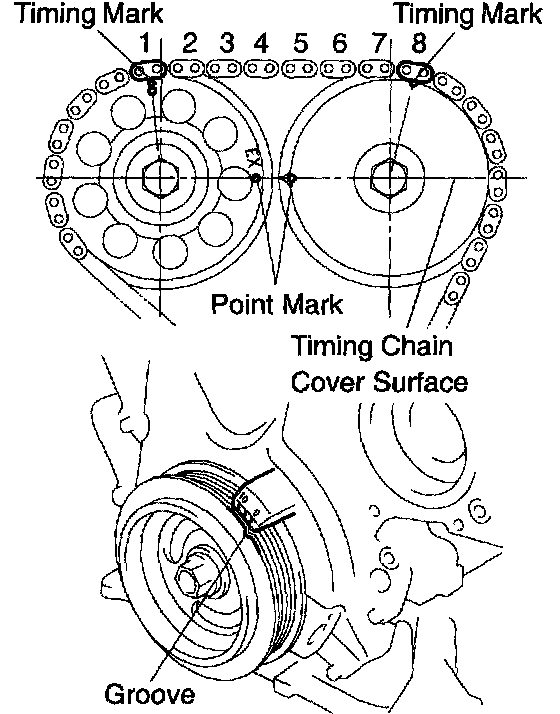 1 Turn the crankshaft pulley, and align its groove with timing mark "0" of the timing chain cover.