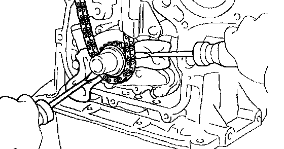 a. Using the 2 screwdrivers, pry out the chain with the crankshaft timing gear as shown in the illustration.