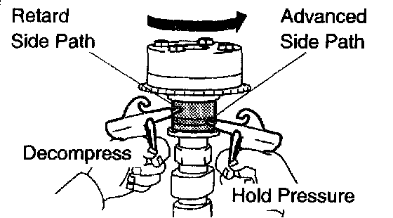 f. When the camshaft timing gear comes to the most advanced position, take out the air pressure of the timing retard side path, and then, takeout that of timing advance side path.