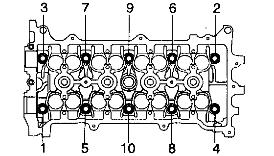 a. Using a bi-hexagon wrench 10, uniformly loosen and remove the 10 cylinder head bolts, in several passes, in the sequence shown, and remove the 10 cylinder head bolts and 10 plate washers.