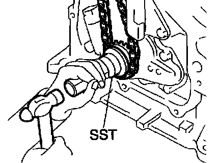 b. Using SST, tap in the oil seal until its surface is flush with the oil seal retainer edge.