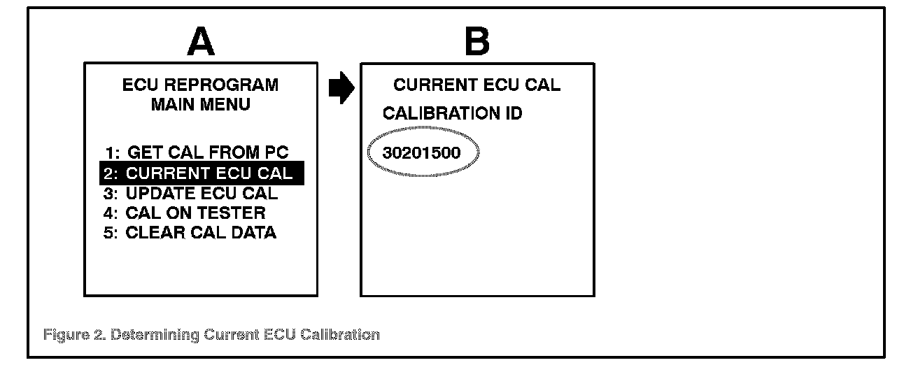 2. Connect the Diagnostic Tester to the vehicle and select CURRENT ECU CAL from the ECU REPROGRAM MAIN MENU. Determine the vehicle's current ECU calibrations (see Figure 2).