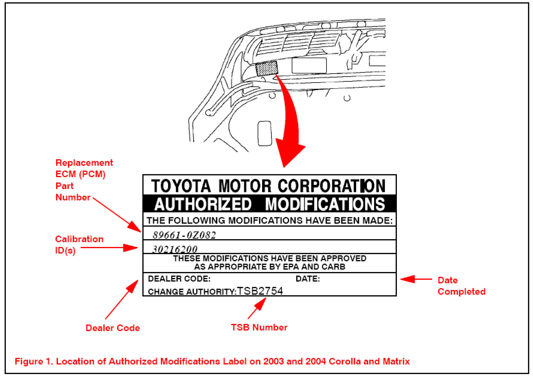1. Check for the Authorized Modifications Label affixed to the vehicle in the location shown in Figure 1. Confirm if the ECM (PCM) calibration has been updated. If the calibration listed is NOT the latest ECM (PCM) calibration - go to step 2.