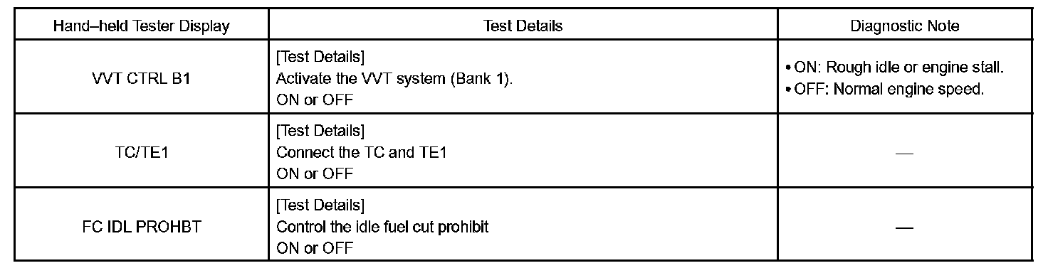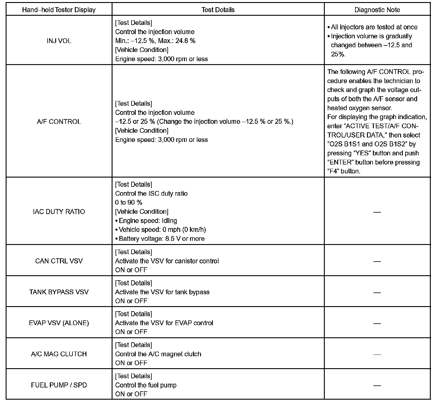HINT: Performing the ACTIVE TEST using the hand-held tester or the OBD II scan tool allows the relay, VSV, actuator and so on to operate without parts removal. Performing the ACTIVE TEST as a first step of troubleshooting is one method to shorten diagnostic time.