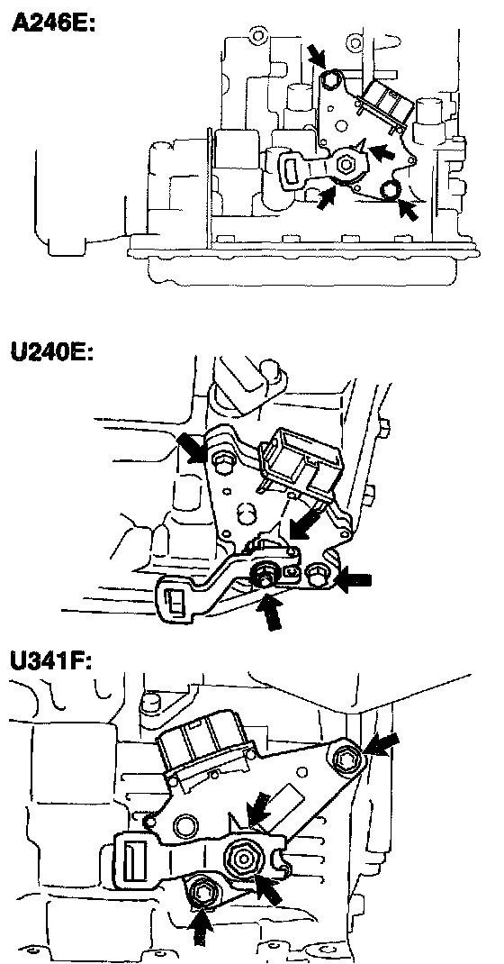 b. A246E/U341F: Install the control cable with the clip to the bracket.