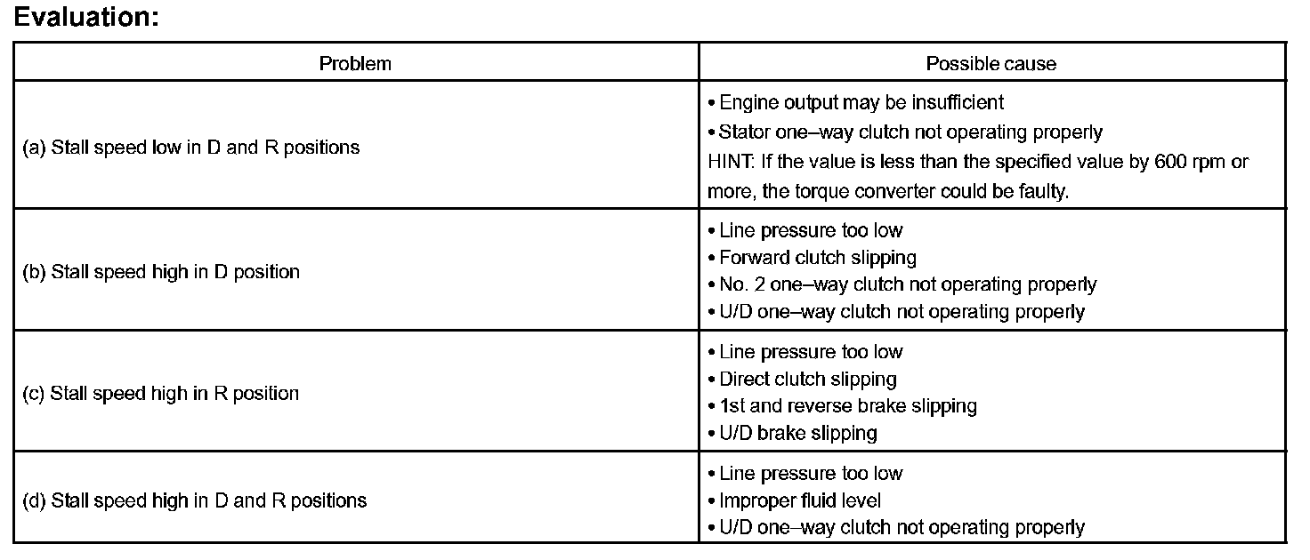 The object of this test is to check the overall performance of the transaxle and engine by measuring the stall speeds in the D and R positions.