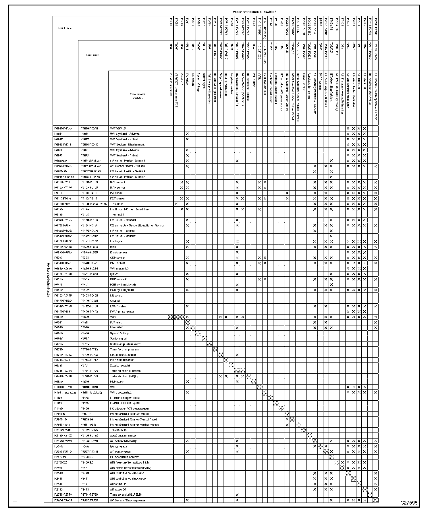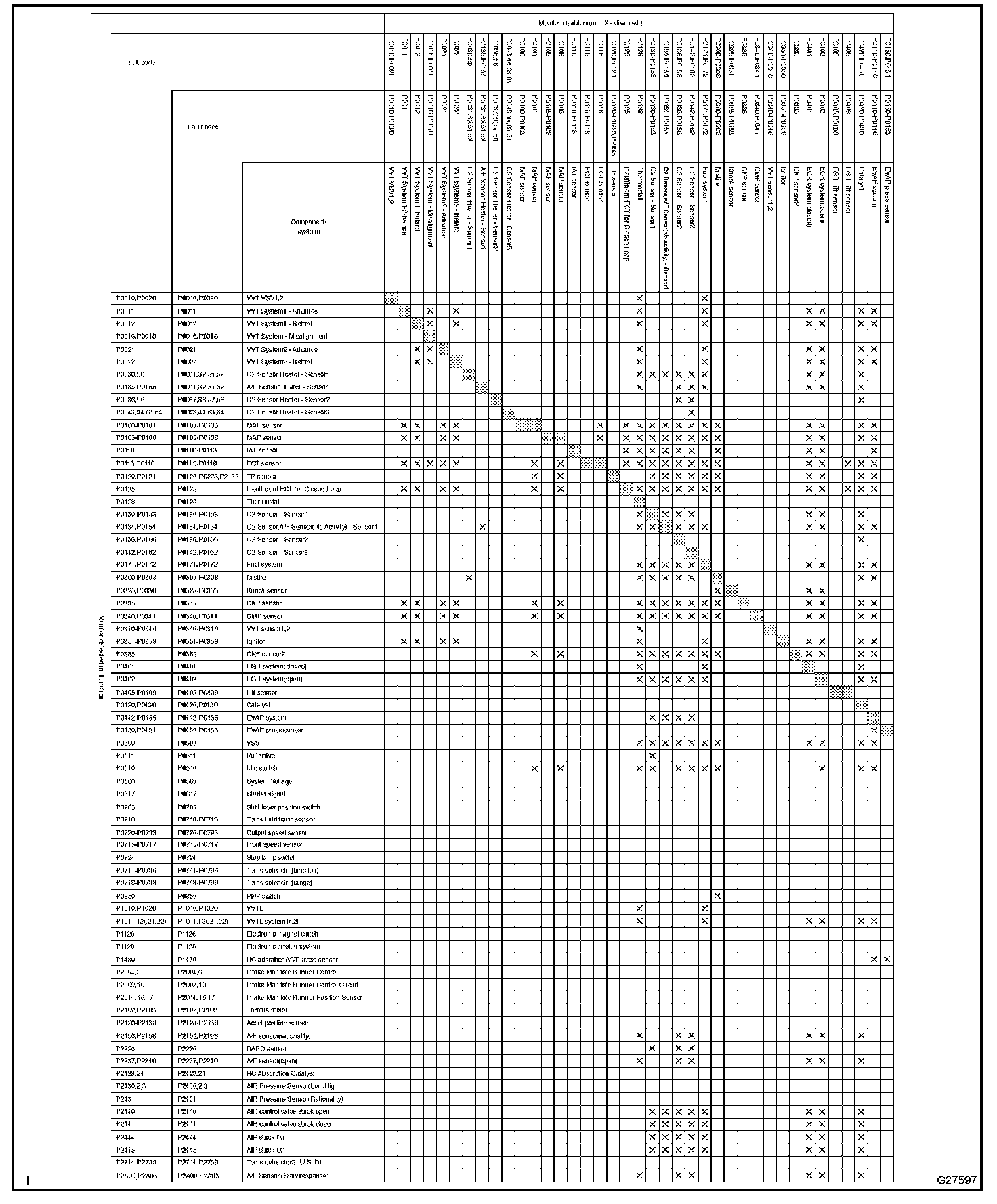 The table indicates ECM monitoring status for the items in the upper columns if the DTCs in each line on the left are being set.