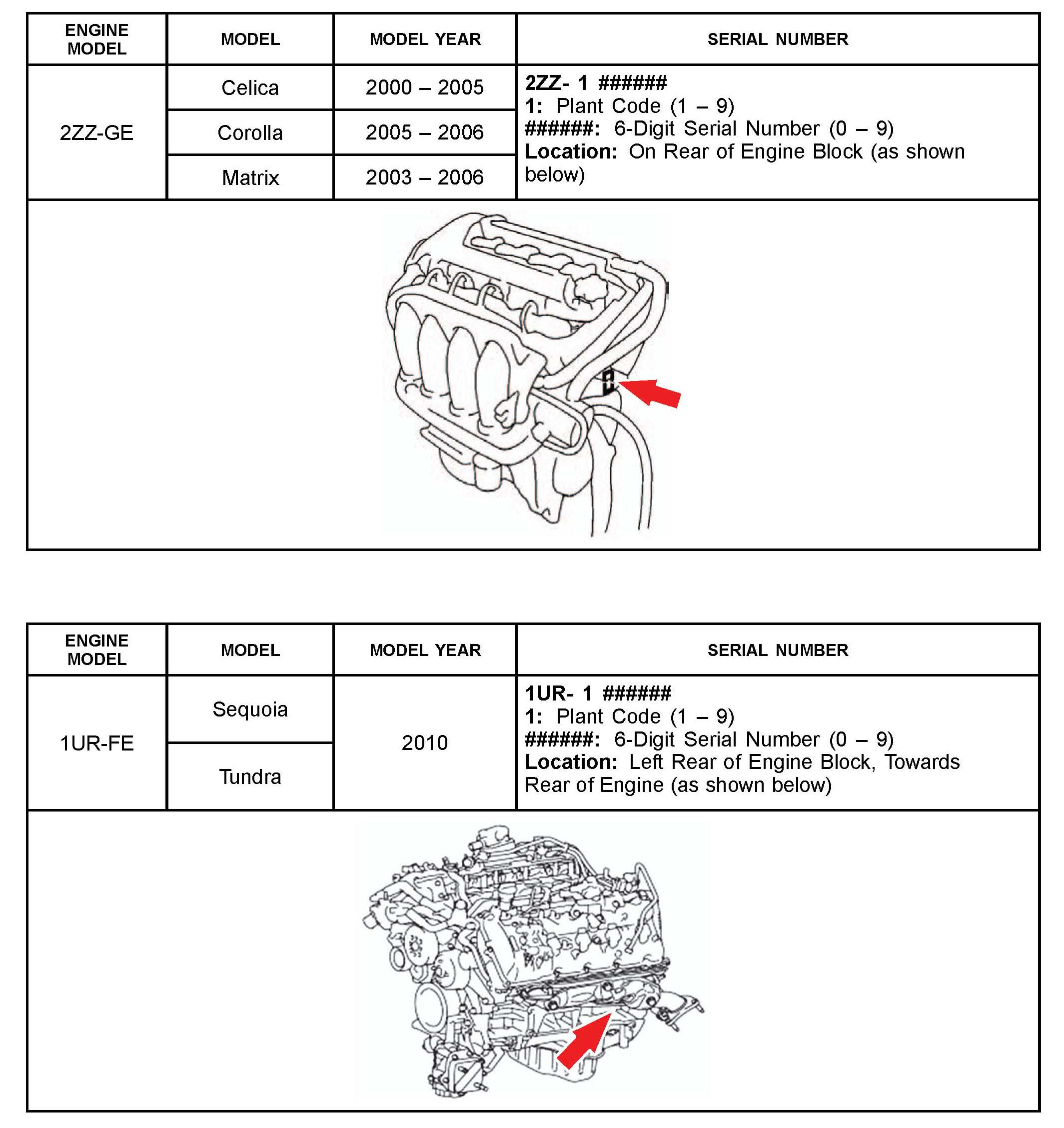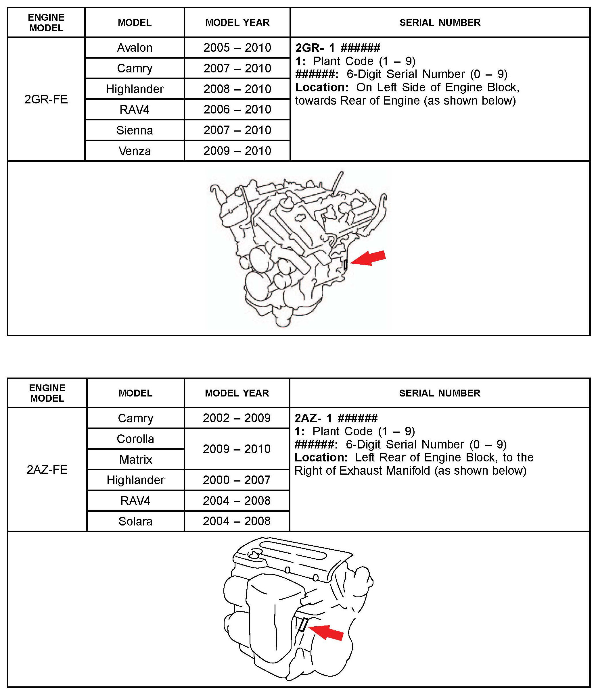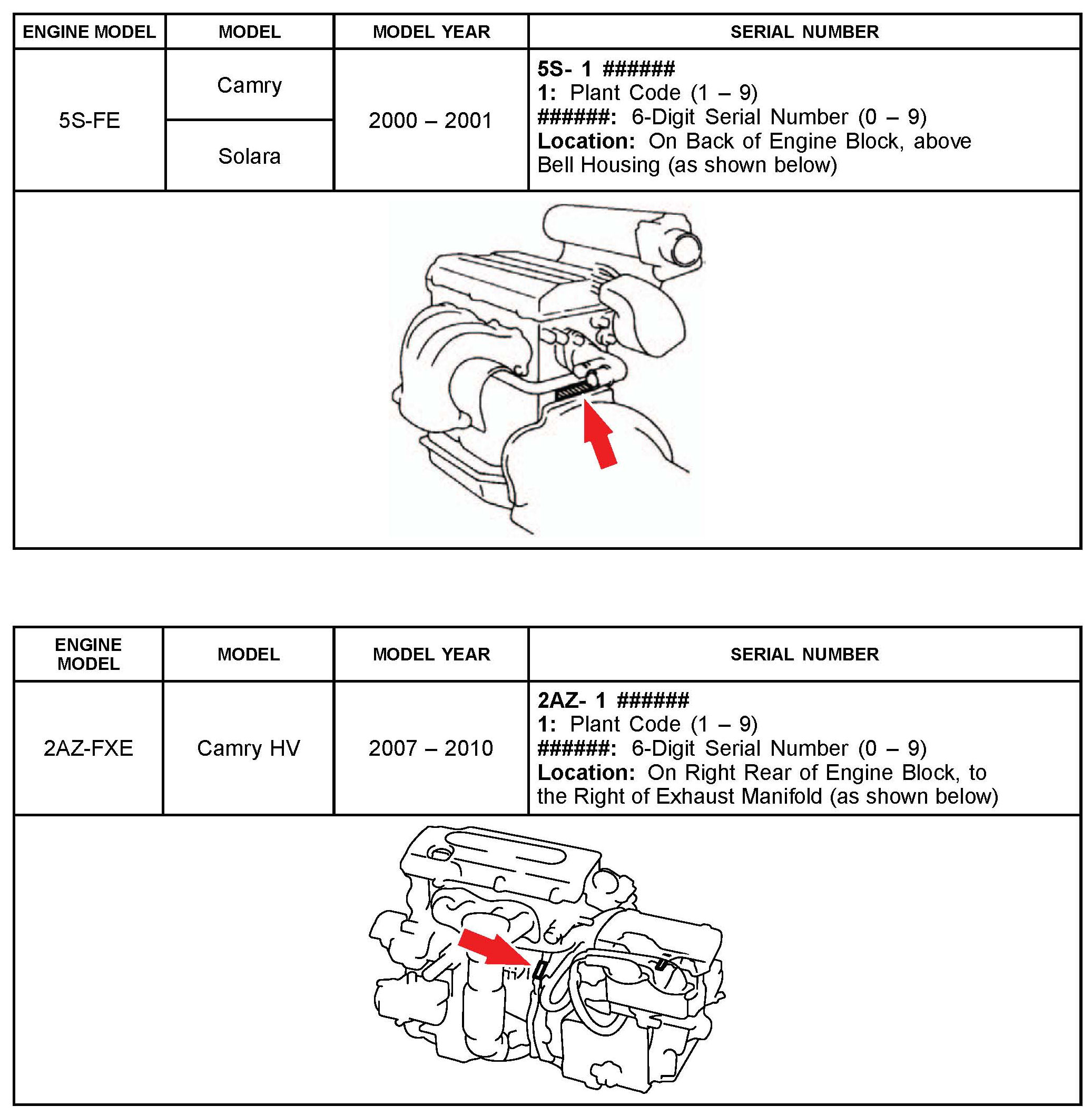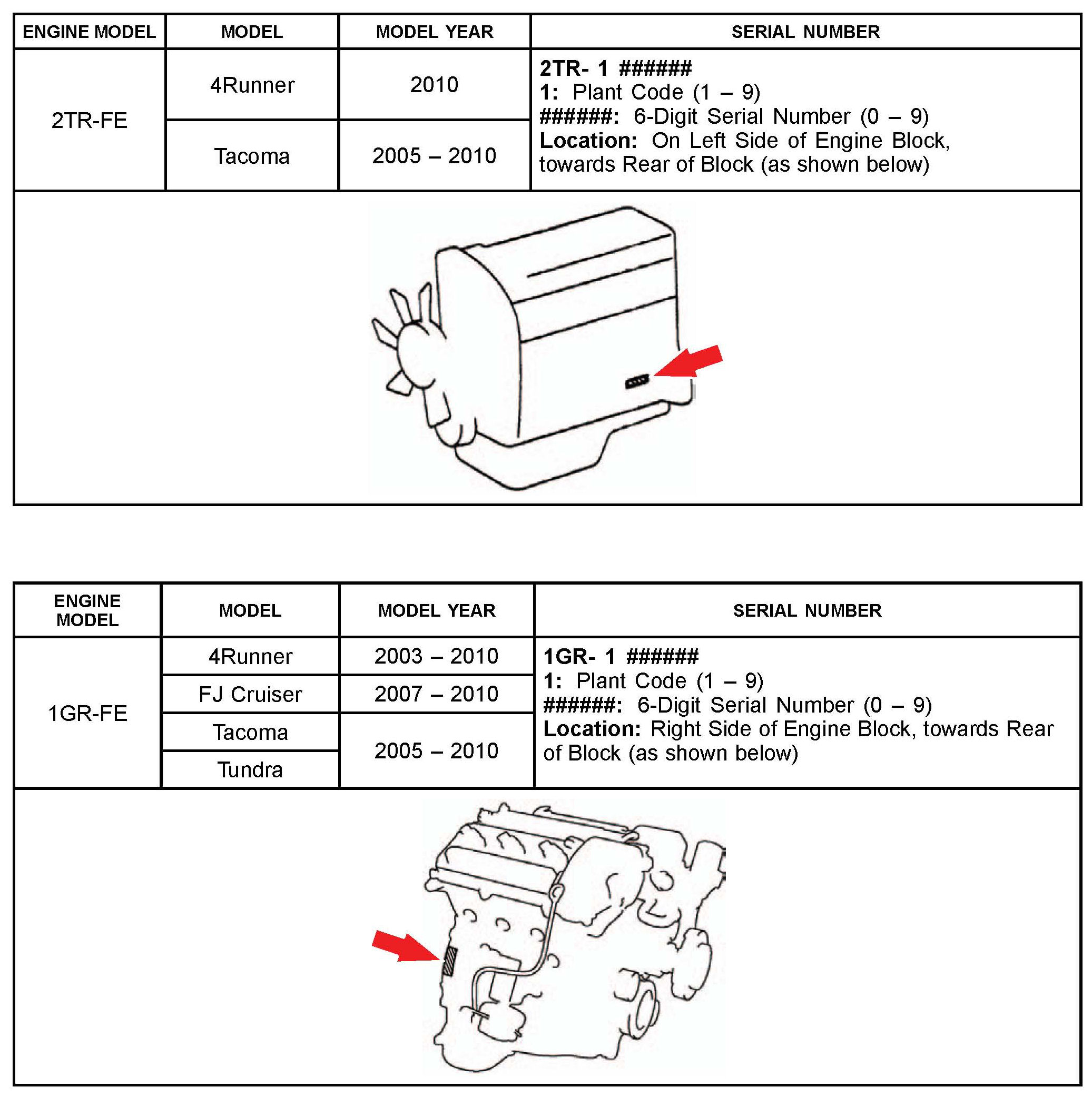 The purpose of this TSB is to assist in the identification and location of engine serial numbers on 2000 - 2010 model year Toyota vehicles.