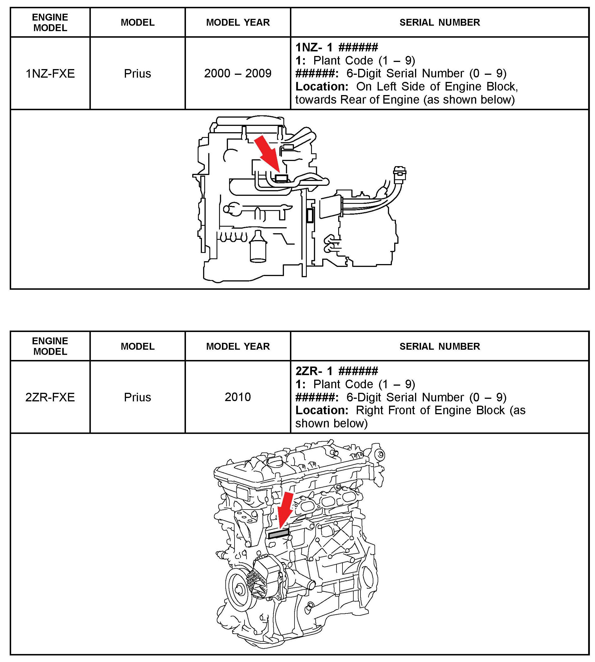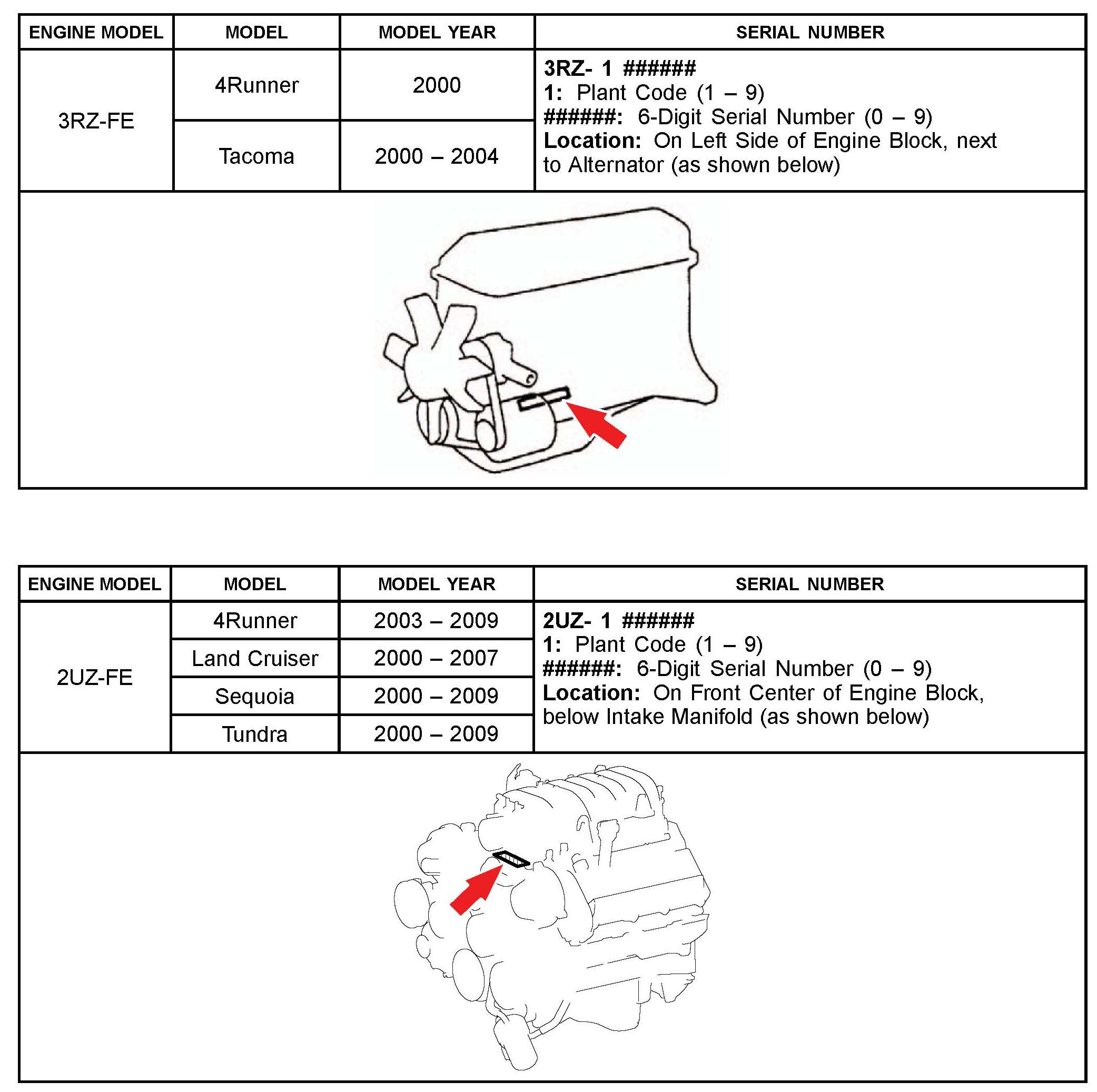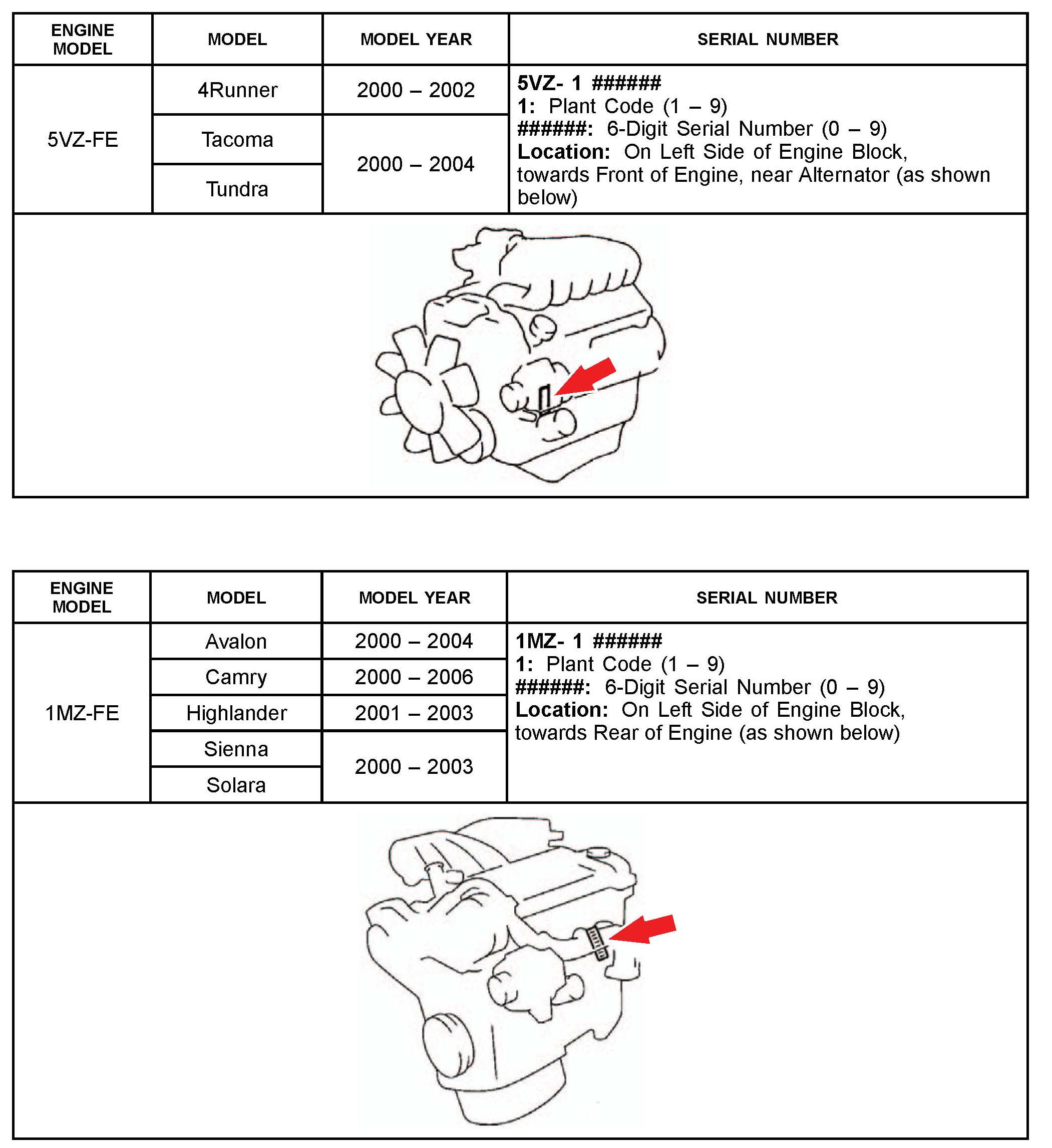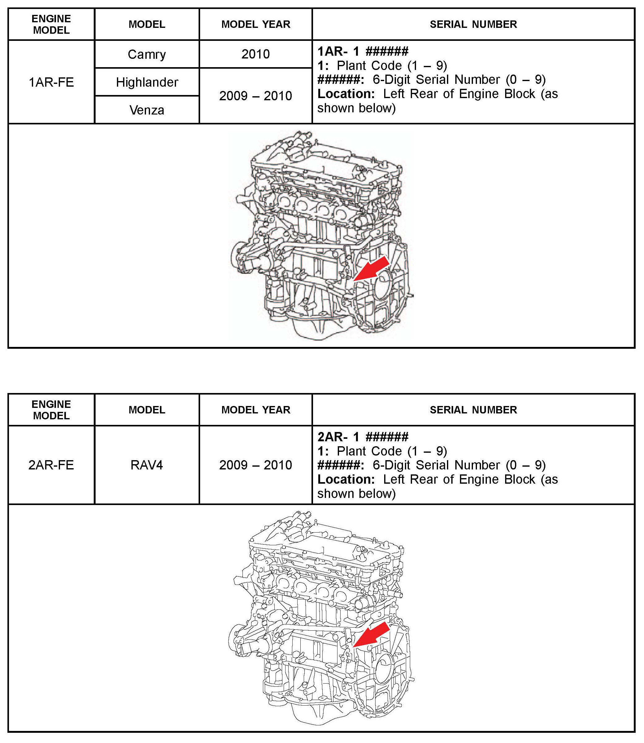 The purpose of this TSB is to assist in the identification and location of engine serial numbers on 2000 - 2010 model year Toyota vehicles.