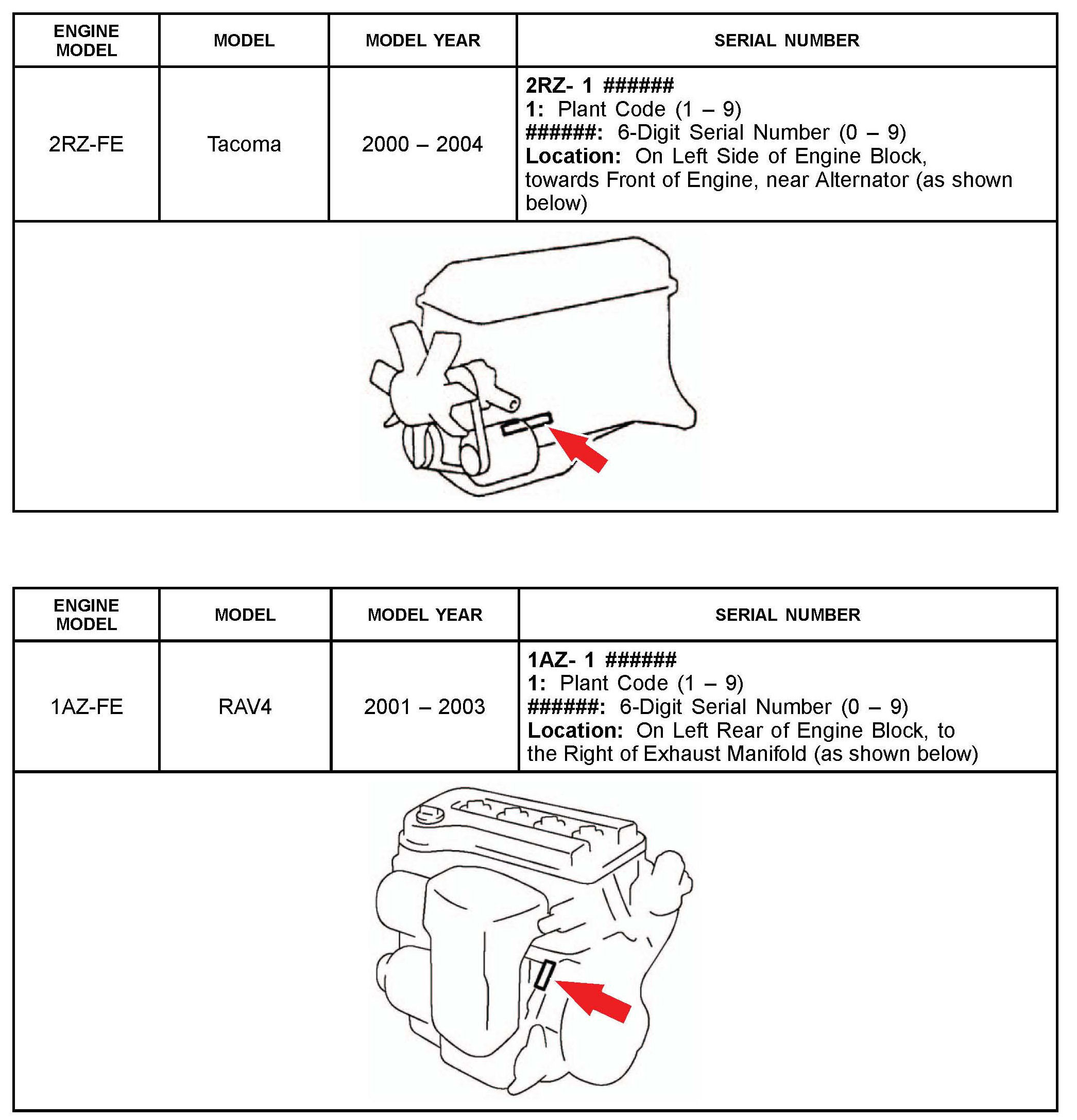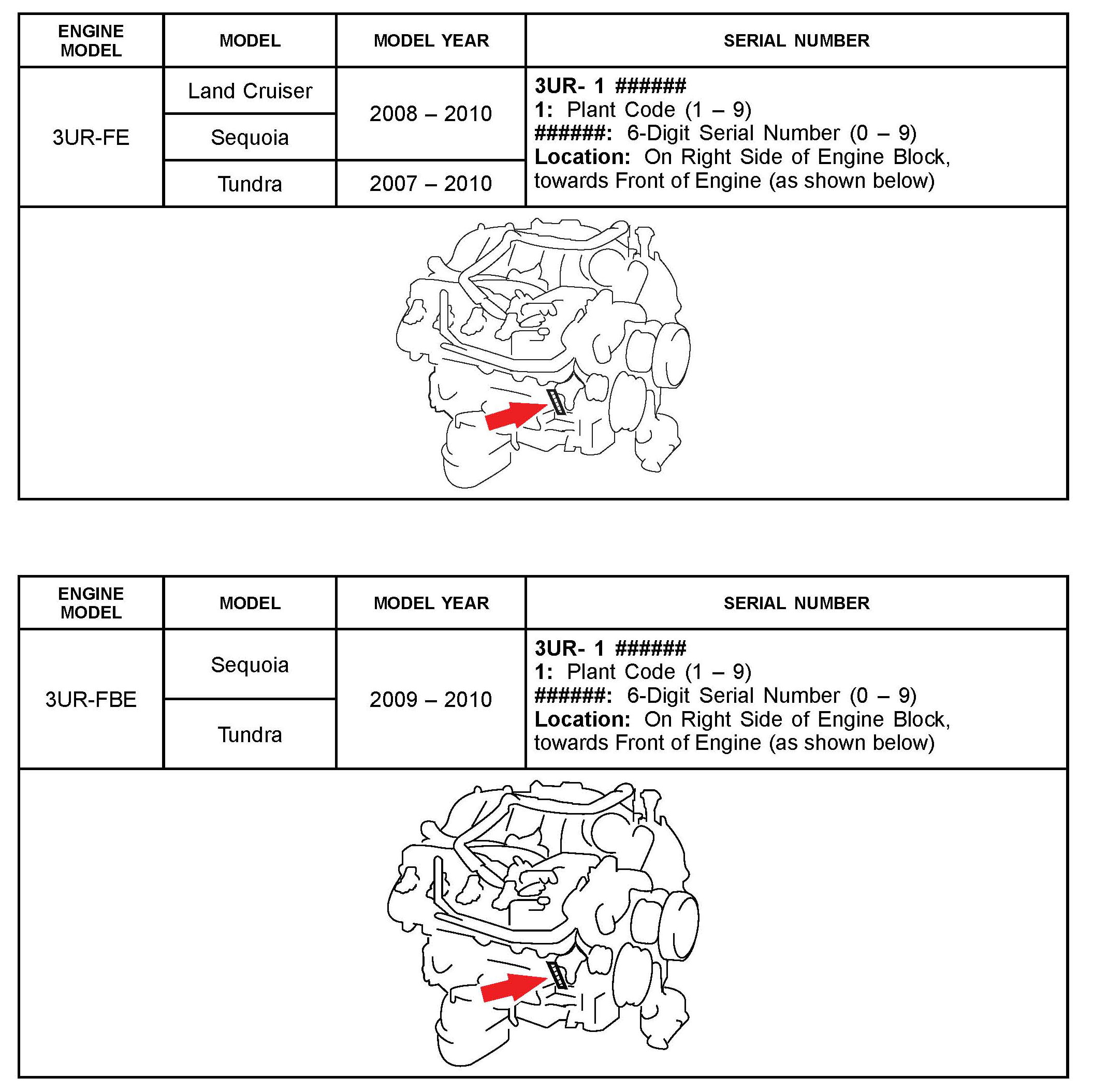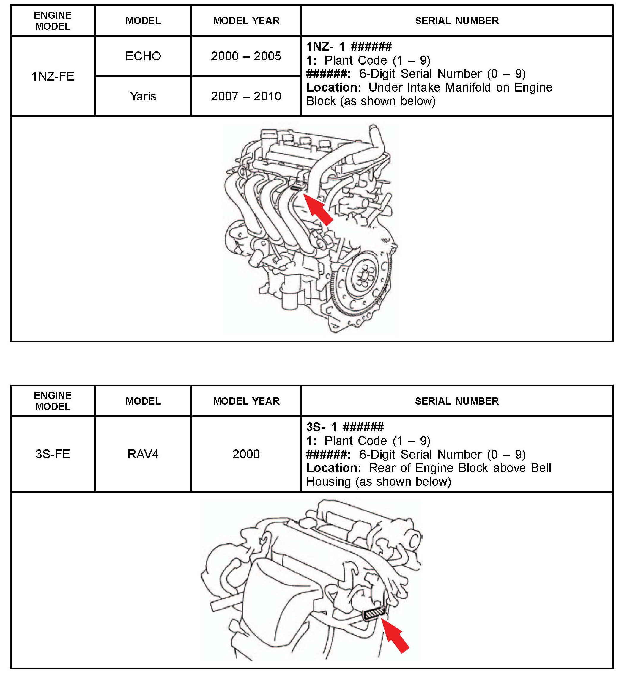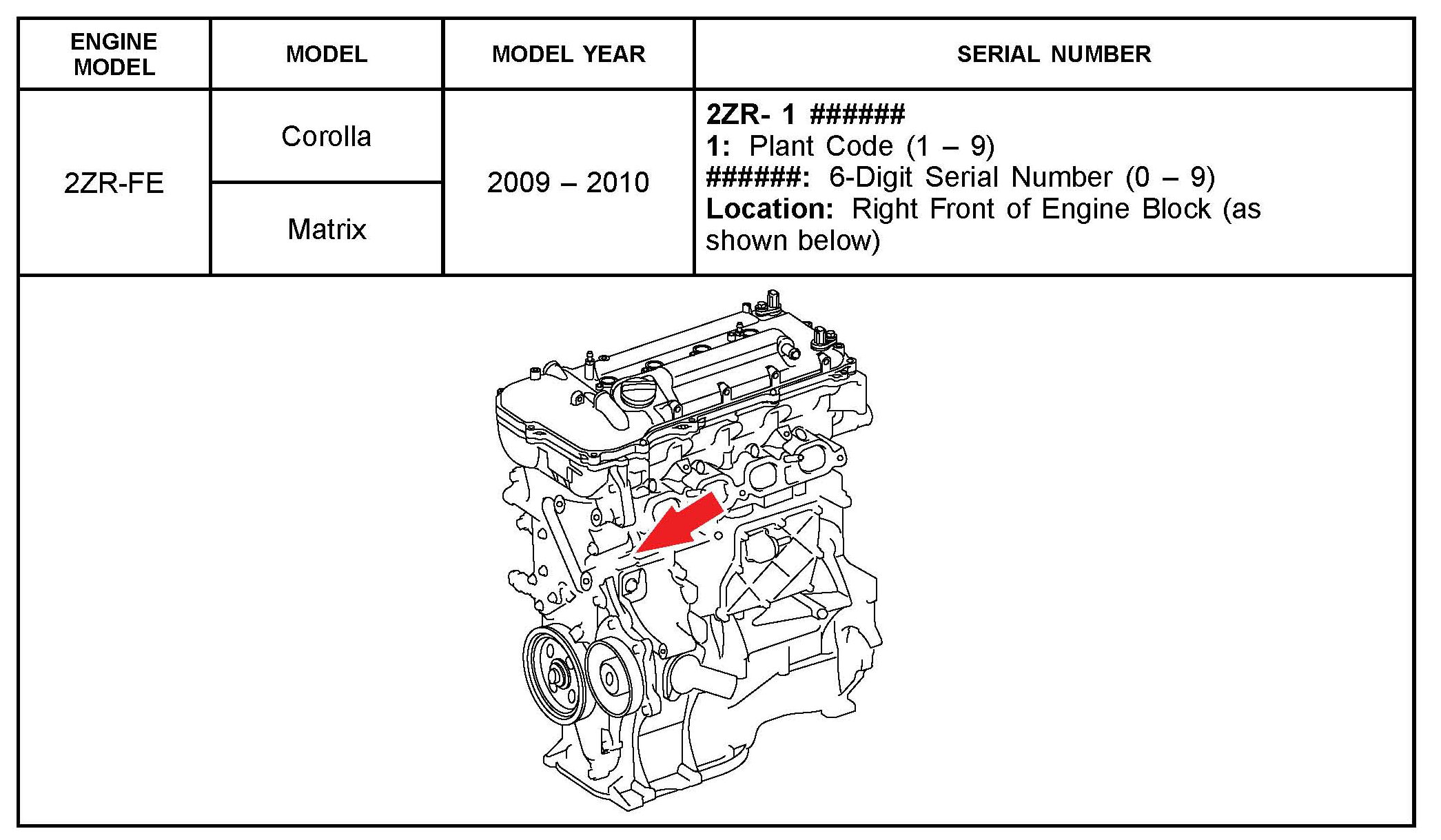 The purpose of this TSB is to assist in the identification and location of engine serial numbers on 2000 - 2010 model year Toyota vehicles.