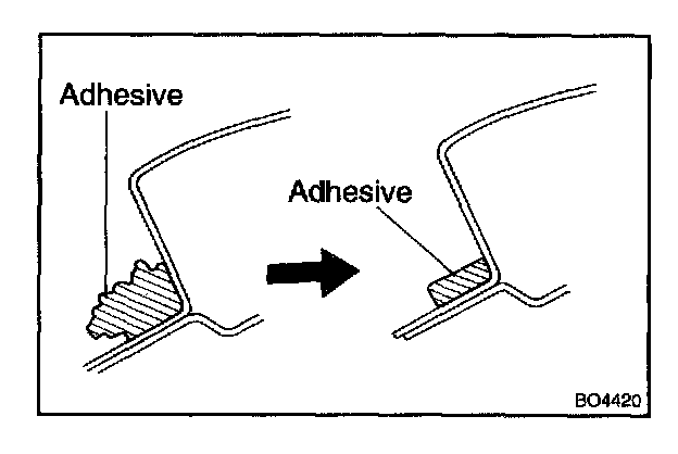 a. Using a scraper, remove the damaged stoppers, dam and adhesive sticking to the glass.